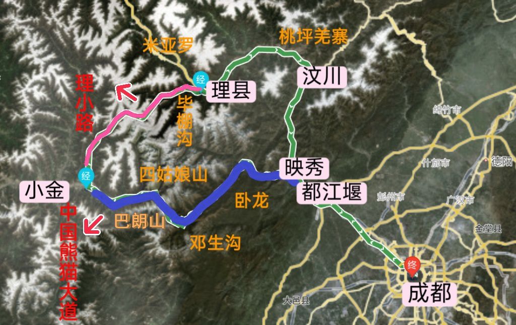 理小路的开通,也打通了一条从成都出发500多公里的短途旅游环线,囊括众多“顶流”景区和小众景点。从成都顺时针方向出发,会经过世界“最佳旅游乡村”桃坪羌寨、以红叶等著称的米亚罗风景区、毕棚沟、红石滩等理小路沿线小众景区、四姑娘山景区、巴朗山、邓生沟、神树坪熊猫基地、都江堰等地,感受从成都平原到邛崃山系巨大的地形落差和不同的自然景观。