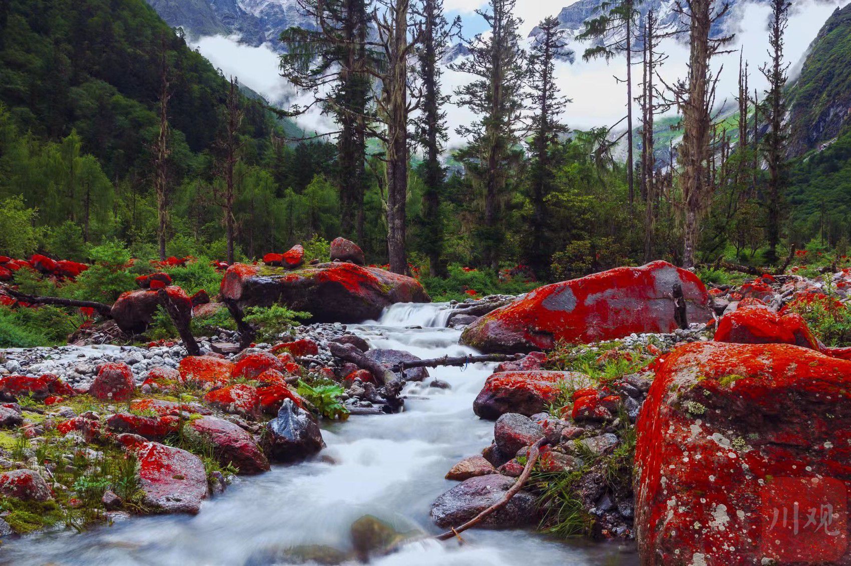 比如与毕棚沟一山之隔的姊妹沟——凉台沟,是理县朴头镇梭罗沟的支沟,沟口海拔2500米左右,全长16公里。除了雪山、森林、草甸、溪流、瀑布,规模宏大的红石滩值得一提,它是除了四川甘孜州海螺沟红石滩之外中国第二大红石滩。红石滩的石头并非天生红色,而是其表面常常生长一种红色的约利橘色藻,当漂砾物大片分布,将河谷染成红色,在山谷里绵延一两公里非常壮观。