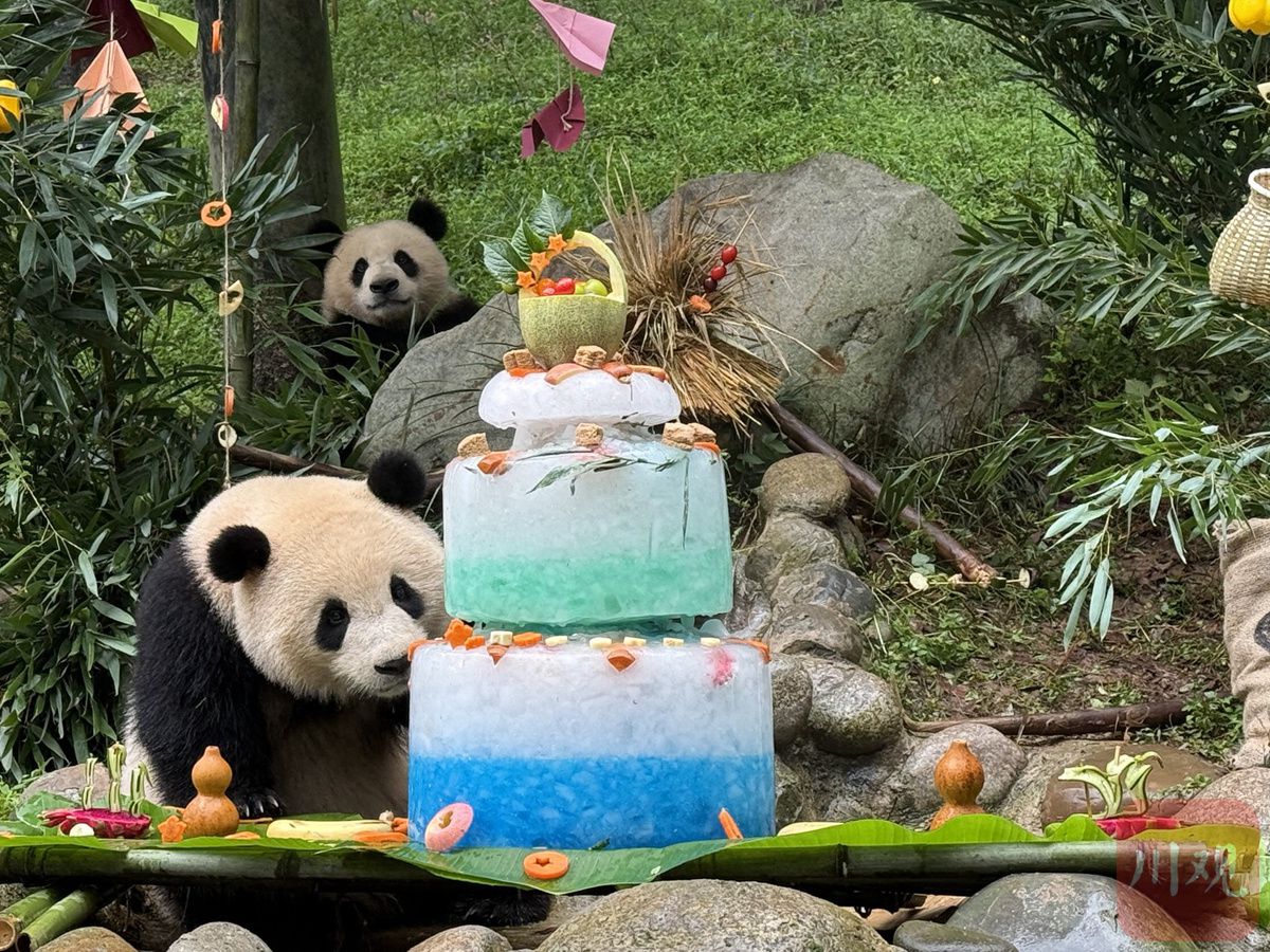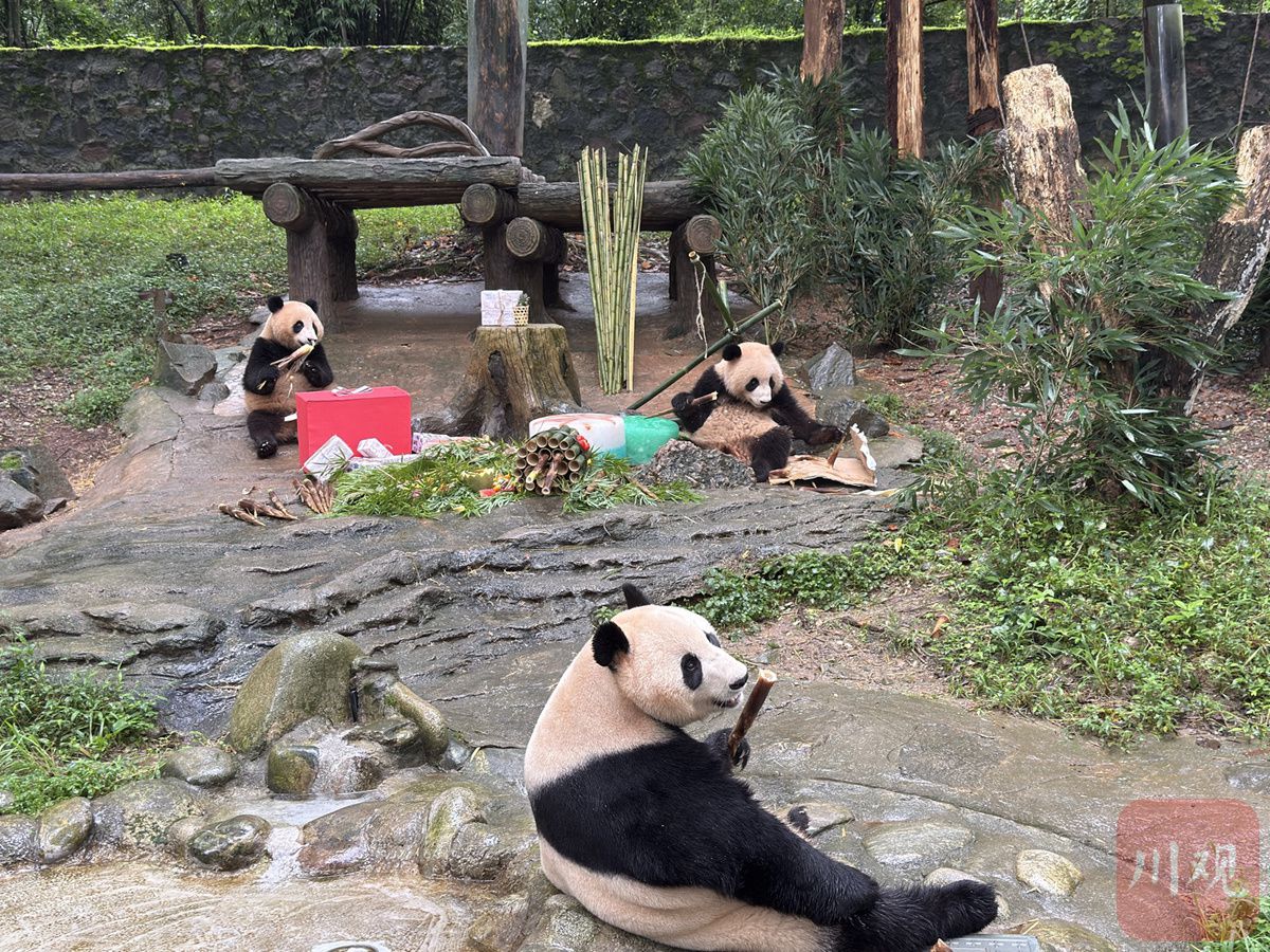 每年的7至9月,是这里大熊猫的集中繁育季,也是大熊猫的生日季。在现场,奶爸奶妈们为“叻叻”“鑫鑫一家”“苏阳”“蕊蕊一家”“春野”“秋野”“牧野”等大熊猫精心制作了各式丰容物品。例如,竹竿、竹叶、芭蕉叶组合而成的舒适大床,原本平平无奇的纸箱摇身一变成为旗袍和狮子形态,竹子祈愿树上挂满了果蔬和千纸鹤,还有玉米秆和葫芦制作的风铃。丰富多样的食物、认知、感知与环境丰容激发了大熊猫们的好奇心,它们兴奋探索、玩耍嬉戏。