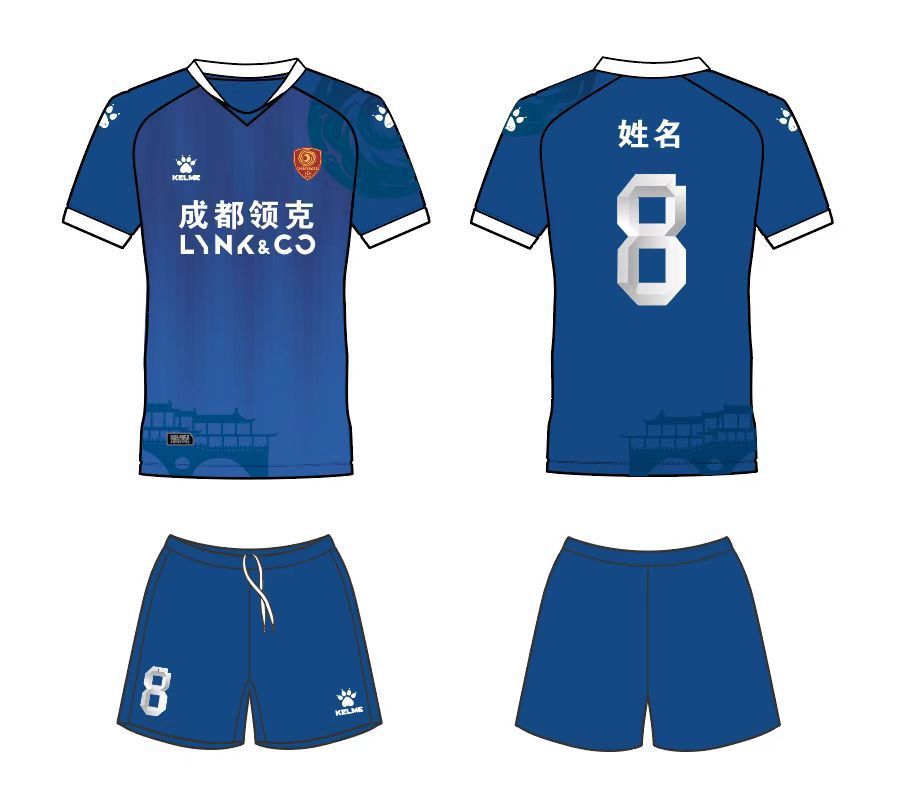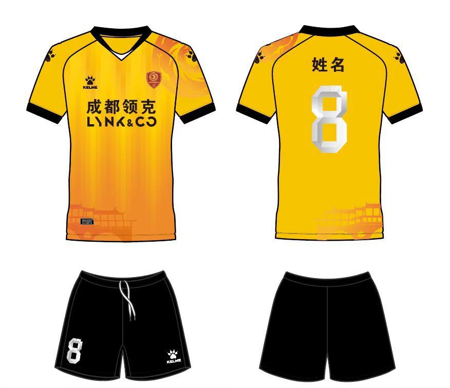 队服款式设计融合成都文化元素与现代足球风格,彰显城市精神:球队主场队服选用黄色为主色调,左肩印有太阳神鸟图腾、右下角呈现九眼桥投影,搭配黑色短裤。球队客场队服选用蓝色为主色调,为通用客场球服。