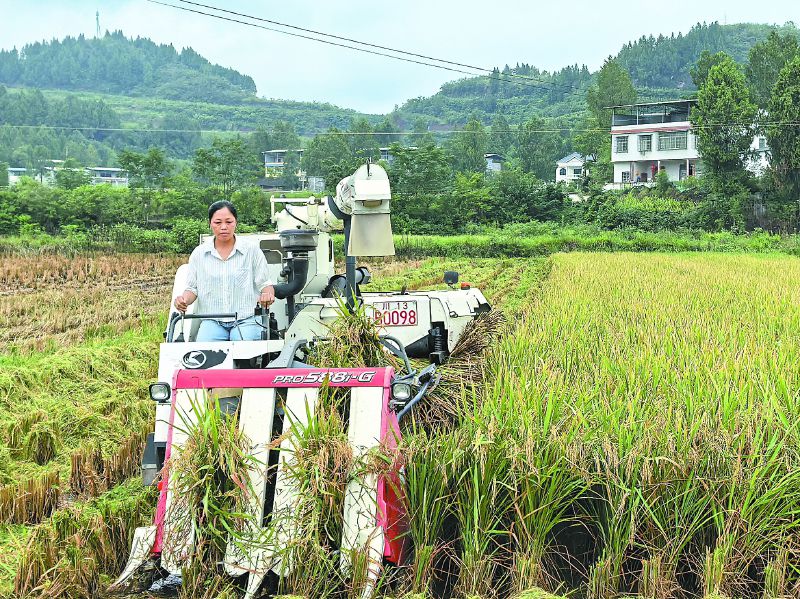 仪陇县赛金镇高家坝村村干部漆小琼驾驶联合收割机帮村民收水稻。