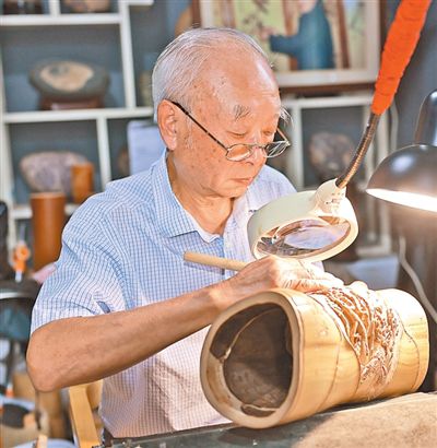 眼盯竹筒,手持弯刀,何华一(见图,本报记者王永战摄)顺着描画好的纹路,寥寥几刀,一幅兰花雕刻便跃然呈现。