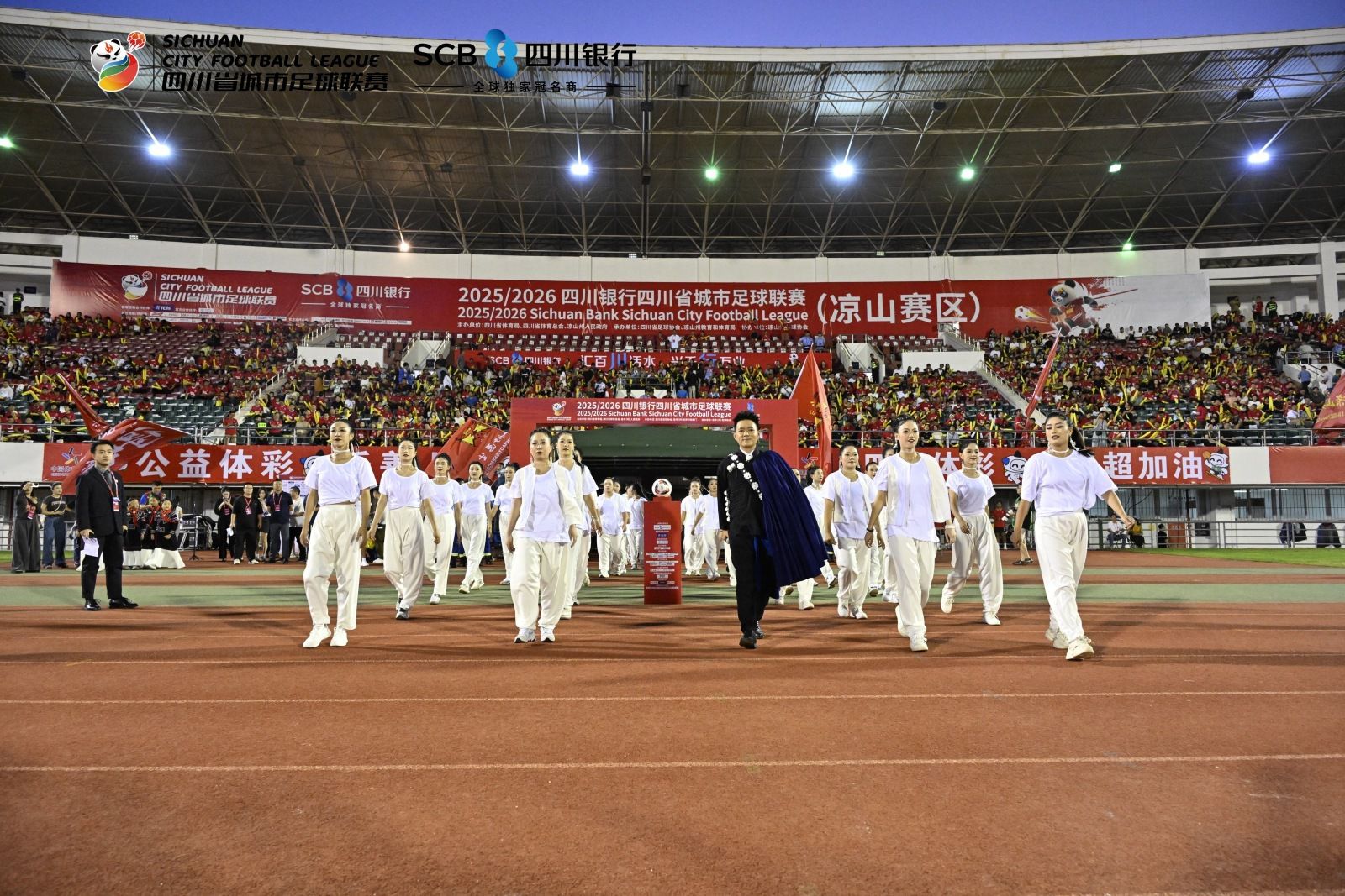 中场休息时,视听盛宴继续上演。凉山州歌舞团青年歌手献唱《凉山之鹰》,歌声里满是雄鹰搏击长空的豪迈。舞蹈演员们刚毅有力的舞姿,将不畏艰难的民族气魄展现得淋漓尽致,不少球迷跟着节奏鼓掌叫好。“既是体育比赛,又像文艺晚会,也像家庭聚会!”坐在西看台的老球迷张建国掏出手机录像,语气里满是震撼,“真没想到凉山的足球氛围这么浓,来的太值了!”