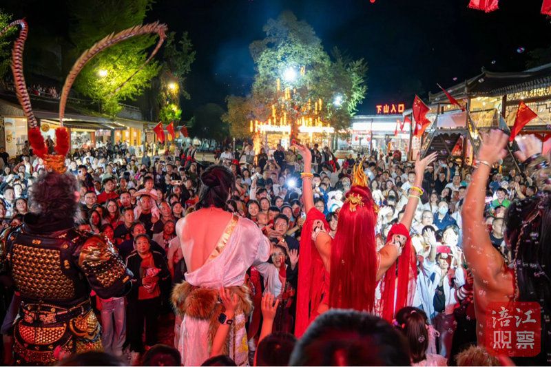 除了白天的文化体验,夜晚的萨朗狂欢节同样精彩。游客可以参与“护送白石、接受赐福”仪式,与巡游的羌族神话NPC互动。来自成都的大学生王强兴奋地说:“和身着传统服饰的羌族演员合影,感觉特别有意思,这些照片发朋友圈肯定能收获很多点赞。”