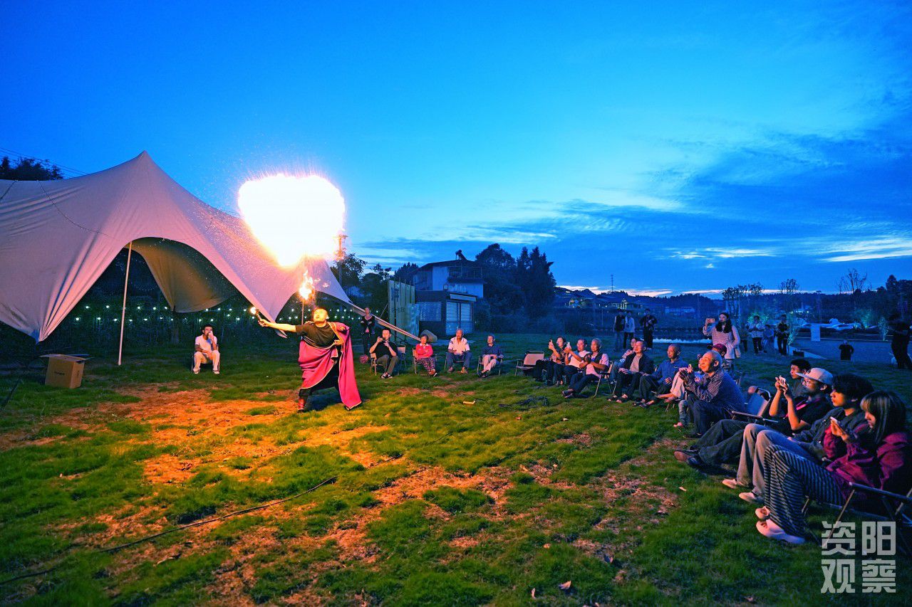 “帅府粮仓”露营基地吐火表演。