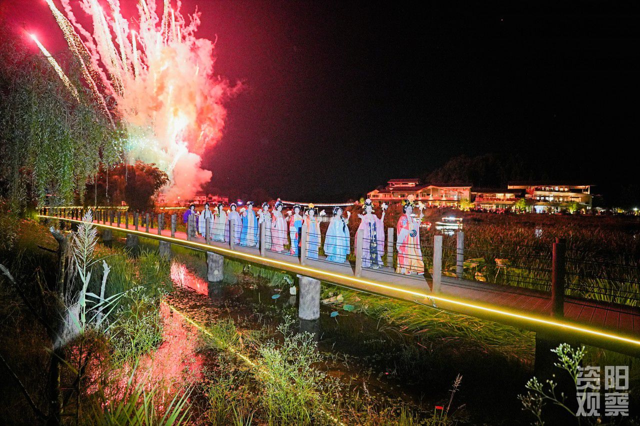 岔岔河岸边,“舟游帅府”项目的码头前排起小队,木质游船缓缓划过水面,游客们举着手机拍摄两岸的风景,不时有人对着“鱼鳞坝”的潺潺流水驻足打卡。傍晚时分,核心区的广场上早已坐满等待烟火秀的游客,孩子们拿着彩色气球奔跑,大人则围着售卖本地竹编、特产的摊位挑选伴手礼,田园间满是热闹的烟火气。
