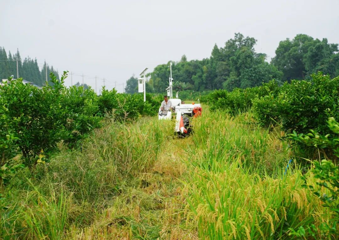 “哇!亩产446.6公斤!”金秋十月的蒲江县西来镇敦厚社区,稻穗沉垂压弯枝,橘香漫野沁心脾。一片果园里竟然有收割机在穿行,果园边围满了人——成都农技总站、市农林科学院和蒲江县农业技术推广中心的专家们在这里进行成都首例“垄上橘 沟下稻”套种模式的丰收测产。