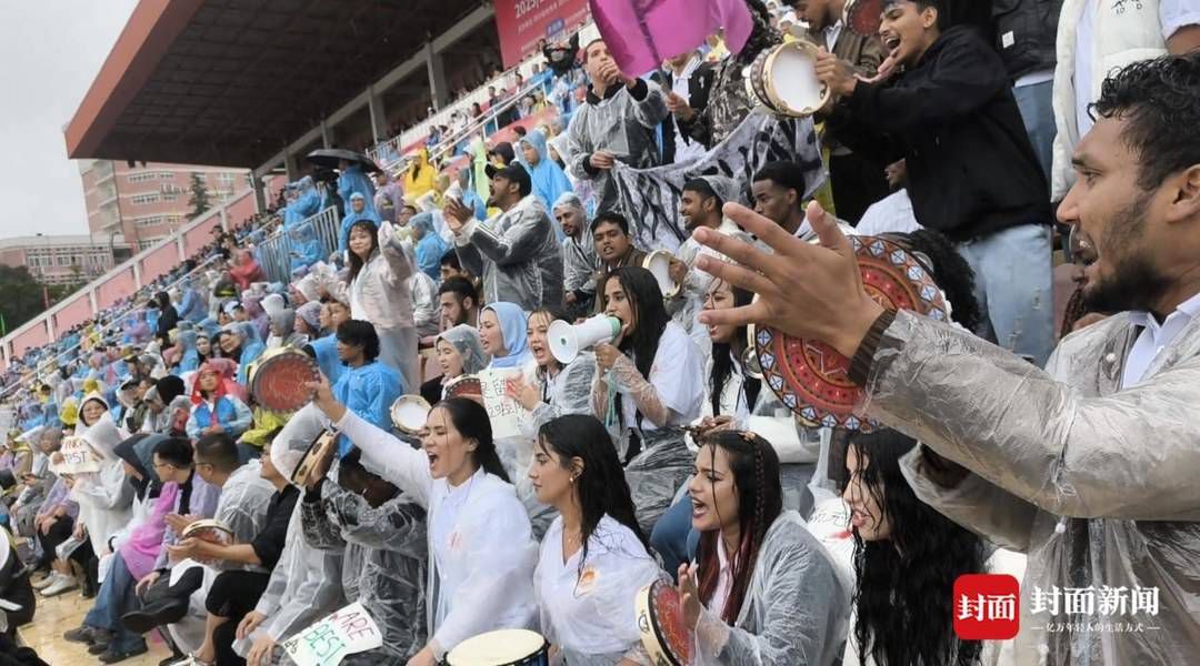 封面新闻记者现场采访了解到,他们中,有些已经来中国2年,有些才刚到1个月。观赛时,大家用中文喊“加油”、四川话喊“雄起”,还以英文、法语、西班牙语、阿拉伯语等多种语言,喊出加油口号助威,笑称自己是“听不懂只能喊加油的球迷团”。