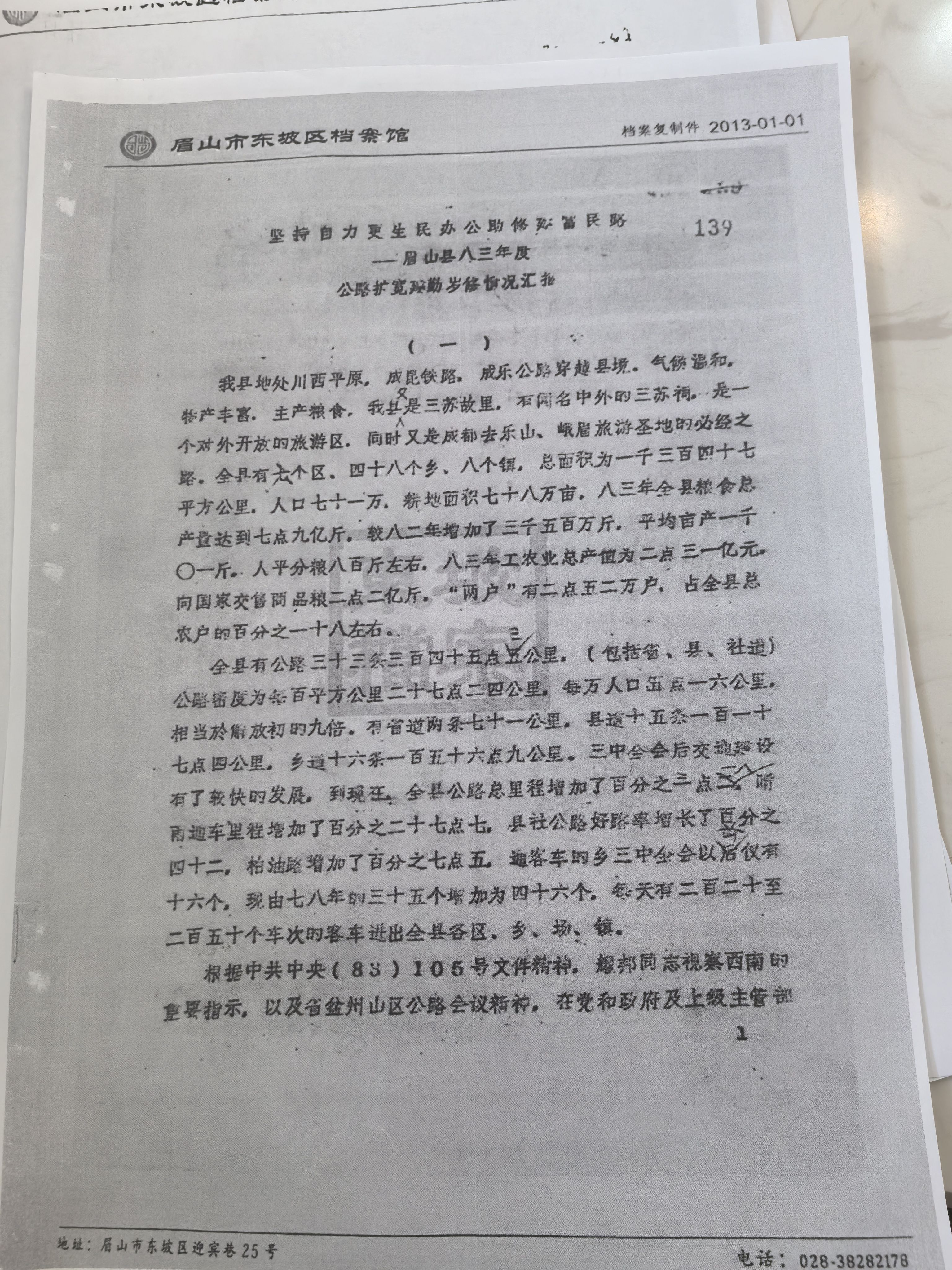 在眉山市党史和地方志编纂中心,一份源于1984年的四川省眉山县人民政府《动员各方力量坚持民办公助加宽整治公路》的档案中开篇即直击痛点:“1983年扩路前,全县345.3公里公路中,标准低、质量差,不少地段晴通雨阻,农民出门行动难,买卖运输物资难,交通事故多。”