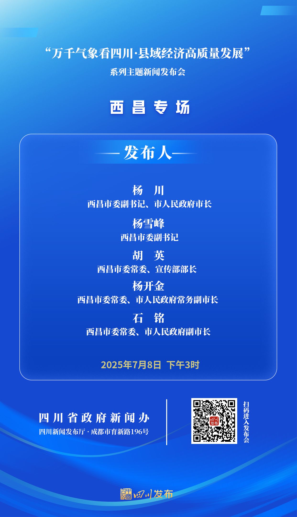 2025年7月8日(星期二)15:00,省政府新闻办将在四川新闻发布厅举行“万千气象看四川·县域经济高质量发展”系列主题新闻发布会西昌专场,西昌市委副书记、市人民政府市长杨川围绕“紧扣三大定位,奋力建设全市人民共同富裕的社会主义现代化西昌”作介绍并答记者问,西昌市委副书记杨雪峰,西昌市委常委、宣传部部长胡英,西昌市委常委、市人民政府常务副市长杨开金,西昌市委常委、市人民政府副市长石铭答记者问。四川发布客户端将全程图文直播,敬请关注!