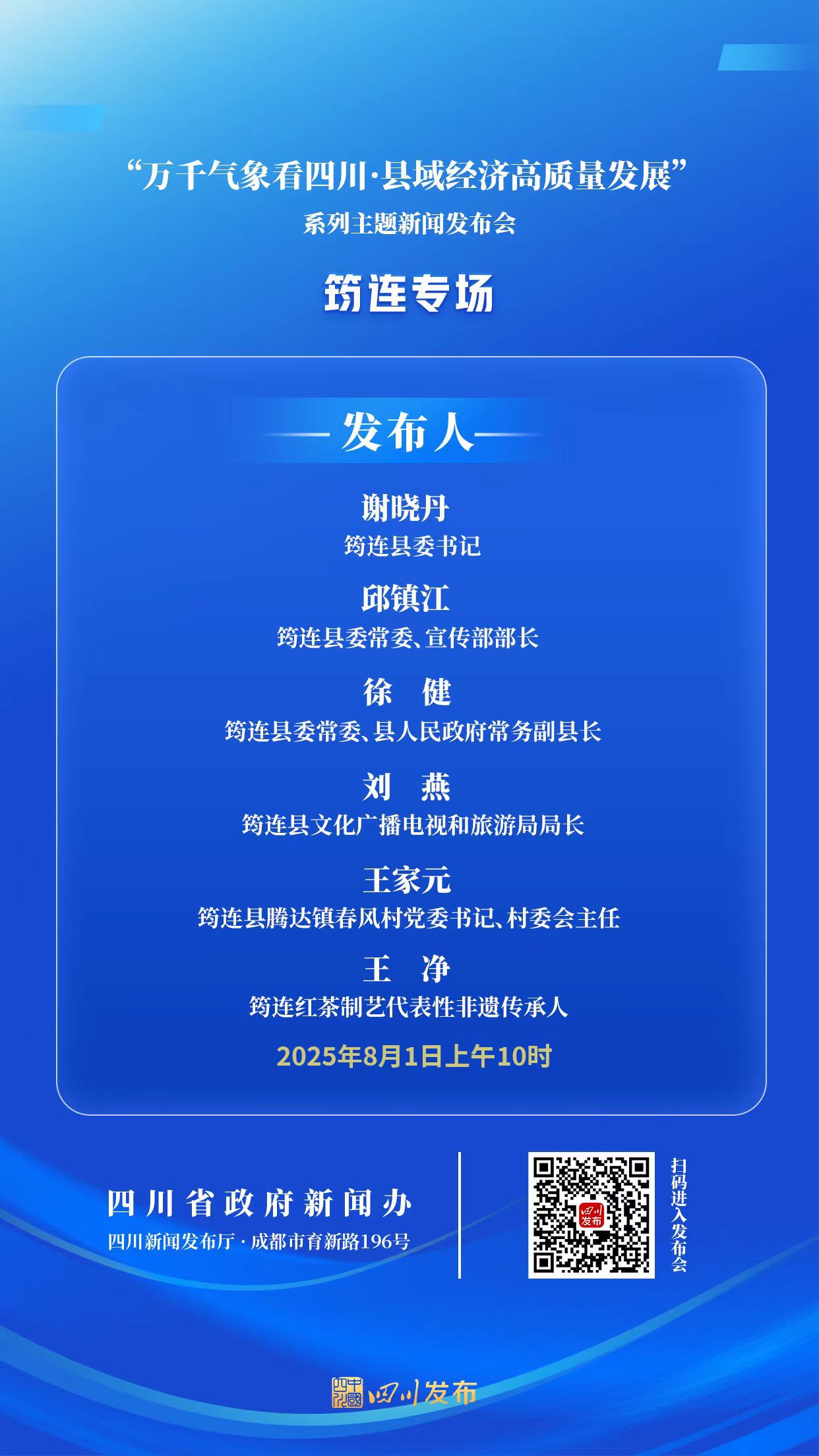 2025年8月1日(星期五)10:00,省政府新闻办将在四川新闻发布厅举行“万千气象看四川·县域经济高质量发展”系列主题新闻发布会筠连专场,筠连县委书记谢晓丹围绕“聚焦‘五个一’幸福密码 解锁川南县域经济中国式现代化筠连发展路径”作介绍并答记者问,筠连县委常委、宣传部部长邱镇江,筠连县委常委、县人民政府常务副县长徐健,筠连县文化广播电视和旅游局局长刘燕,筠连县腾达镇春风村党委书记、村委会主任王家元,筠连红茶制艺代表性非遗传承人王净答记者问。四川发布客户端将全程图文直播,敬请关注!