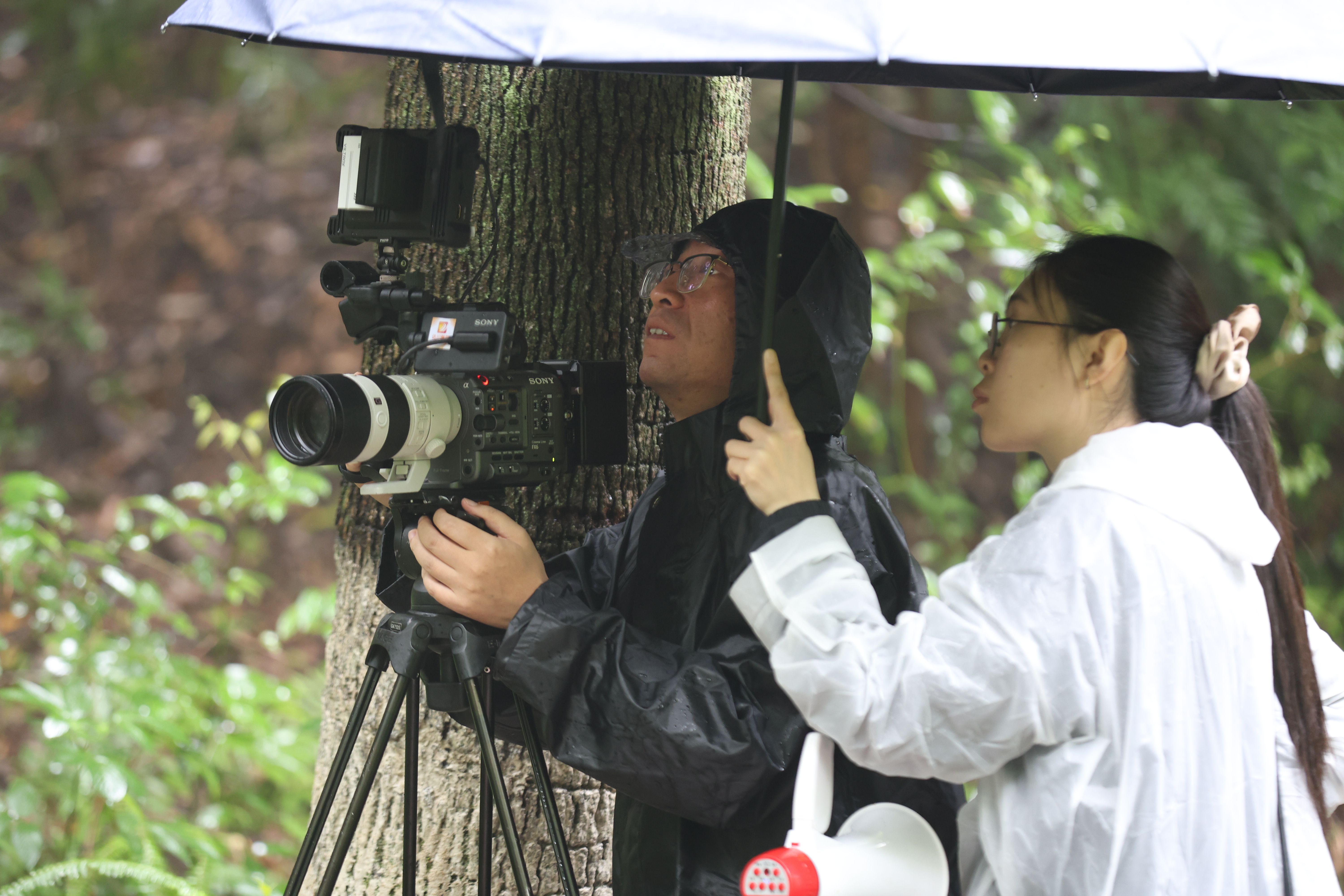 工作人员冒雨拍摄中。