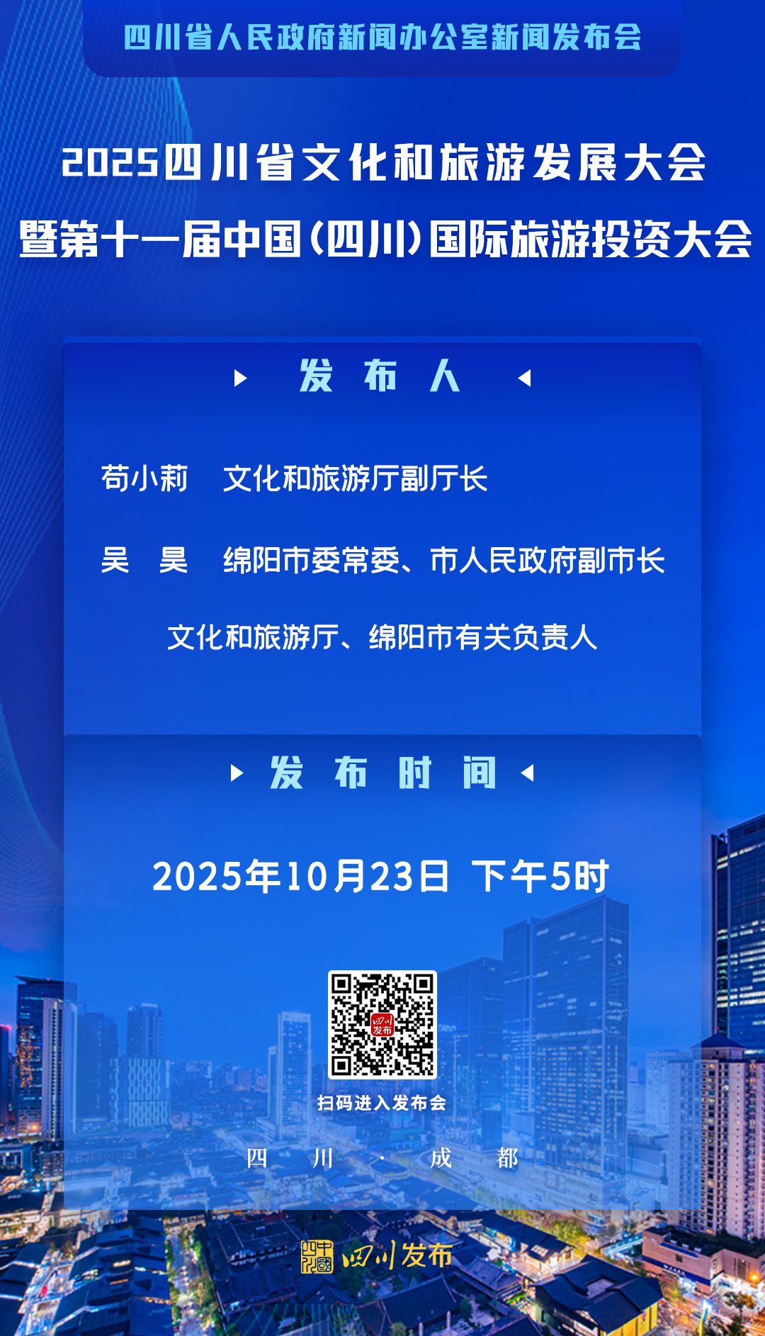 2025年10月23日(星期四)17:00,省政府新闻办将在四川新闻发布厅举行新闻发布会,文化和旅游厅副厅长苟小莉,绵阳市委常委、市人民政府副市长吴昊介绍2025四川省文化和旅游发展大会暨第十一届中国(四川)国际旅游投资大会有关情况并答记者问,文化和旅游厅、绵阳市有关负责人参加答记者问。四川发布客户端将全程图文直播,敬请关注!