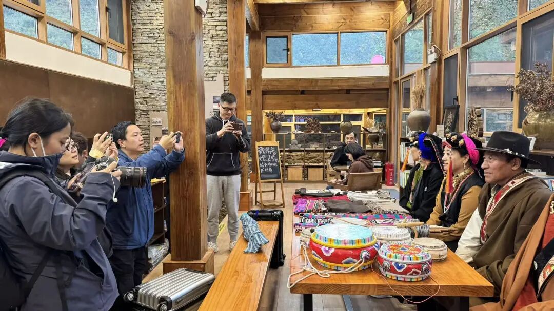 采访团首站到达了丹巴县。从白塔观景台的全景俯瞰,到德吉康瓦民宿的细节探访;从藏香、藏纸、藏鼓、刺绣等非遗项目的亲手体验,到《梨花下的成人礼-岁月织锦》实景剧的现场观摩,记者们用镜头记录细节,用录音笔留存故事,沉浸式了解丹巴县如何以文化为引擎,将其转化为旅游经济价值,带动村民增收致富。