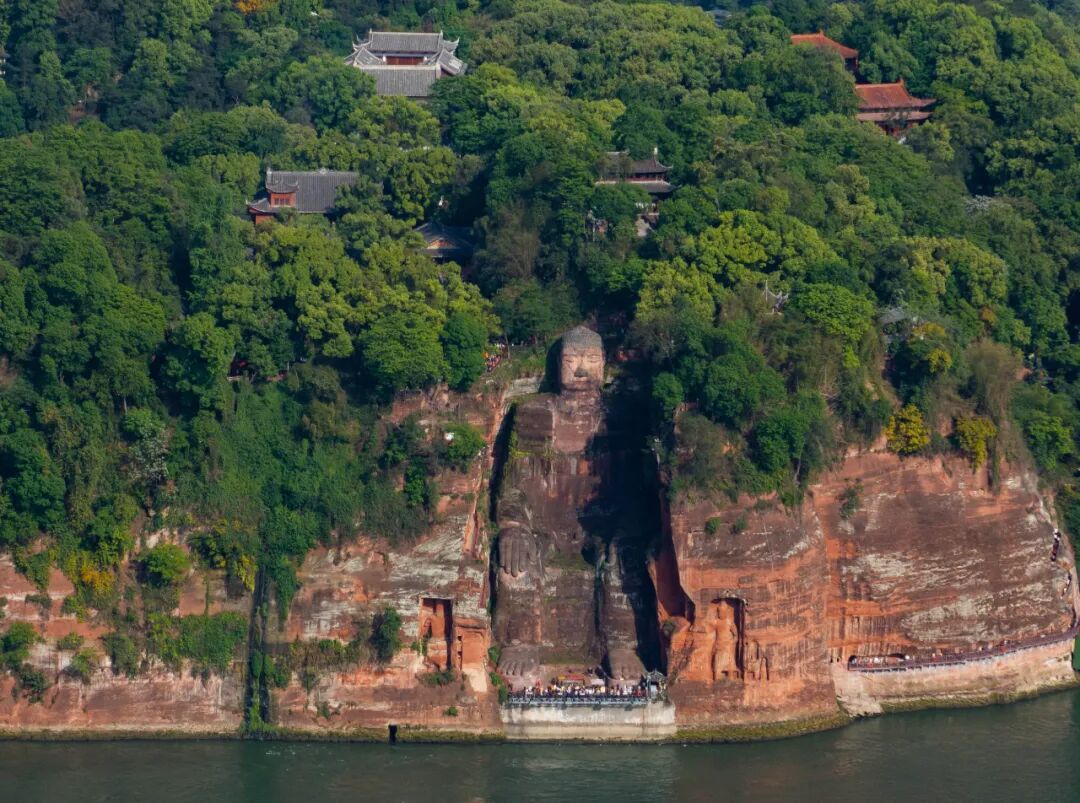 乐山大佛景区位于四川省乐山市中心城区东南面,岷江、大渡河、青衣江三江交汇处。乐山大佛通高71米、历时90年建成,至今已有1300多年的历史。1996年,峨眉山—乐山大佛景区被联合国教科文组织批准列为世界文化与自然遗产。图为2024年4月18日拍摄的乐山大佛(无人机照片)。 新华社记者 江宏景/摄