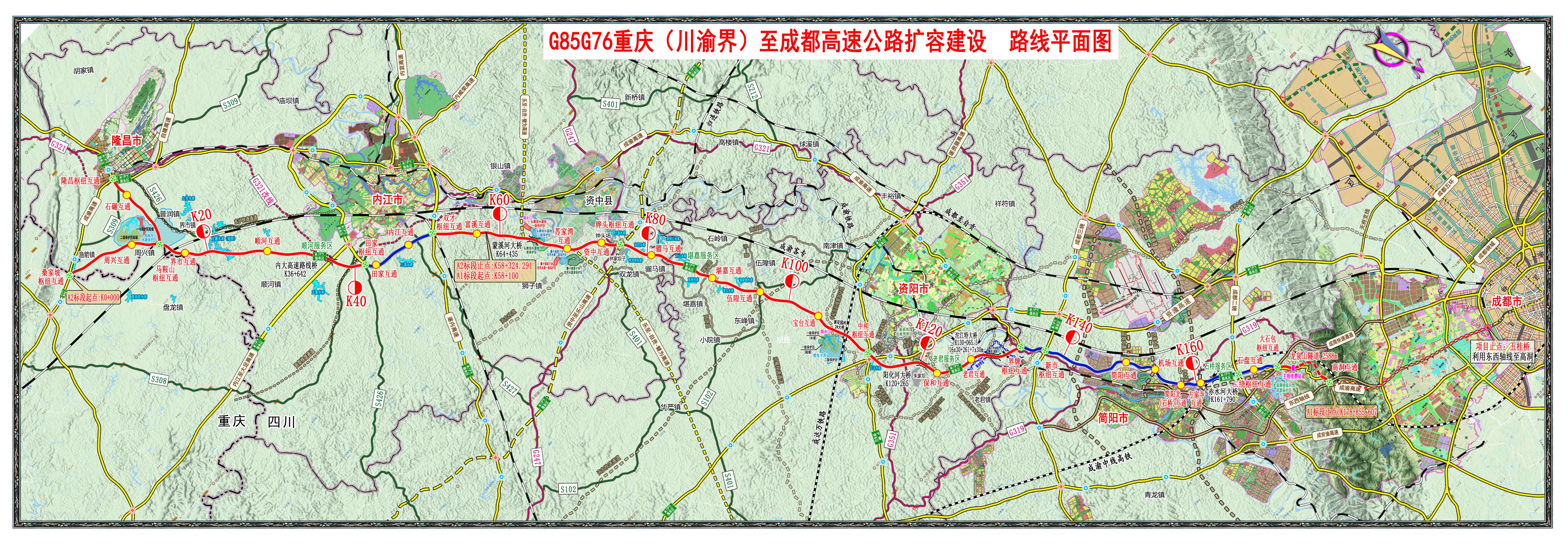 该项目起于内江市桑家坡(川渝界),接G85银昆高速公路重庆段,途经内江市、资阳市、成都市,止于龙泉驿区高洞,接已建成的成都市东西轴线城市道路,全长约190公里,其中主线长179公里,隆昌支线长11公里。