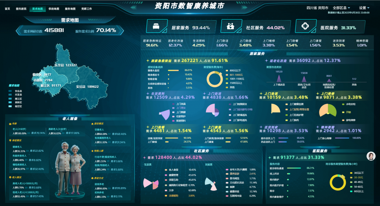 资阳的“数智化”养老探索不止于硬件。今年4月发布的《资阳市数智康养城市建设实施方案》显示,资阳市正不断以智能化赋能养老服务升级,打造“数智康养”平台,并构建起“线上智慧平台 + 线下服务网络”的一体化体系。通过技术赋能,正逐步建立起一张全天候的老年安全健康防护网。