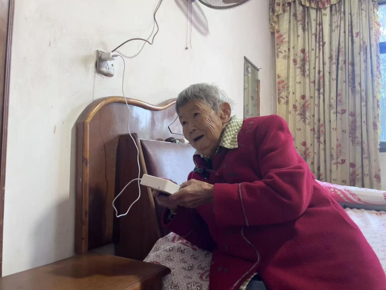 老人使用新安装的一件报警器。全媒体记者 肖子涵 摄