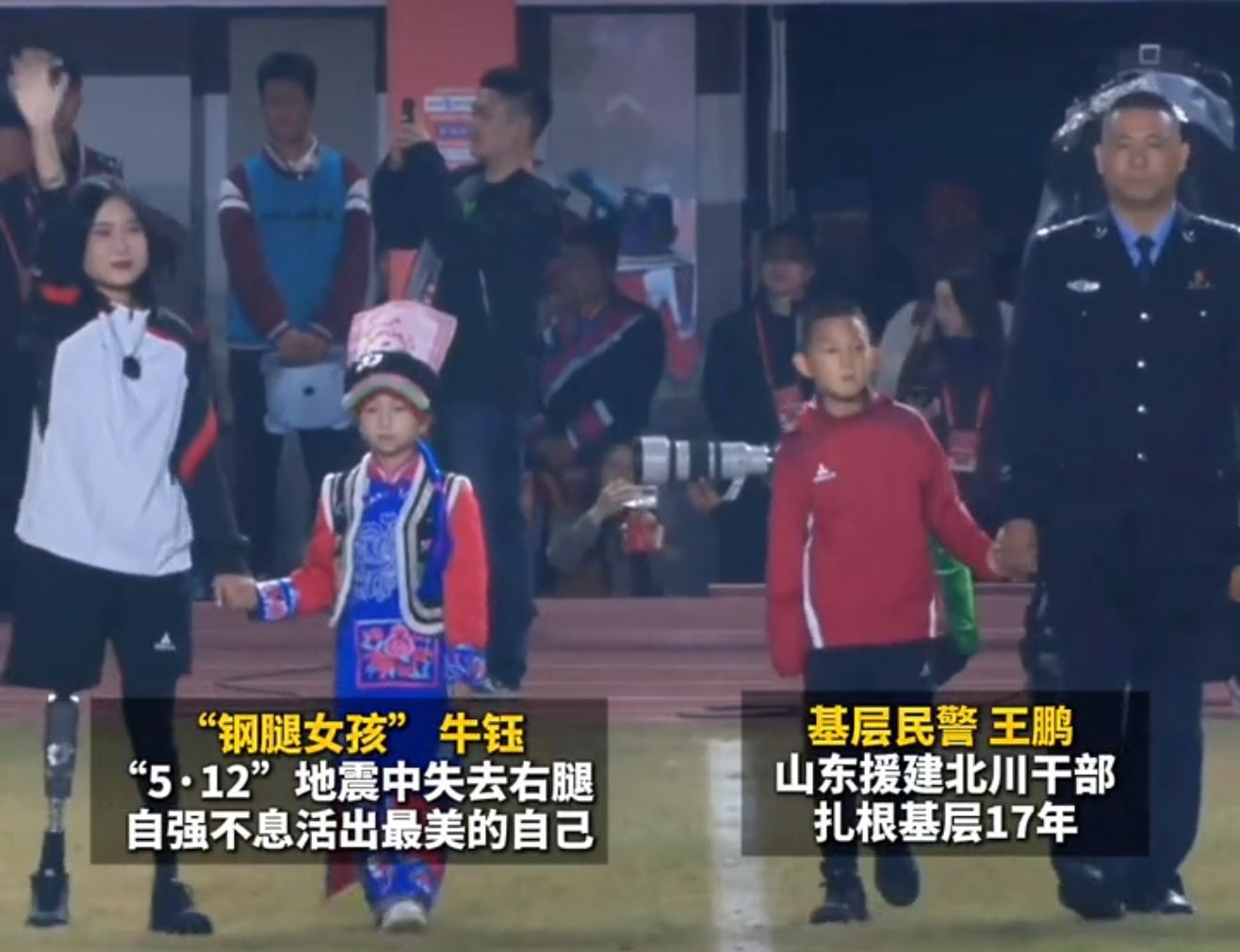 11月1号晚,在绵阳与甘孜的比赛中,两位特殊的开球嘉宾让全场动容:北川“钢腿女孩”牛钰、山东援建北川干部王鹏。开场哨响起的那一刻,两条因“5·12”汶川特大地震而改变的命运轨迹在此交汇。