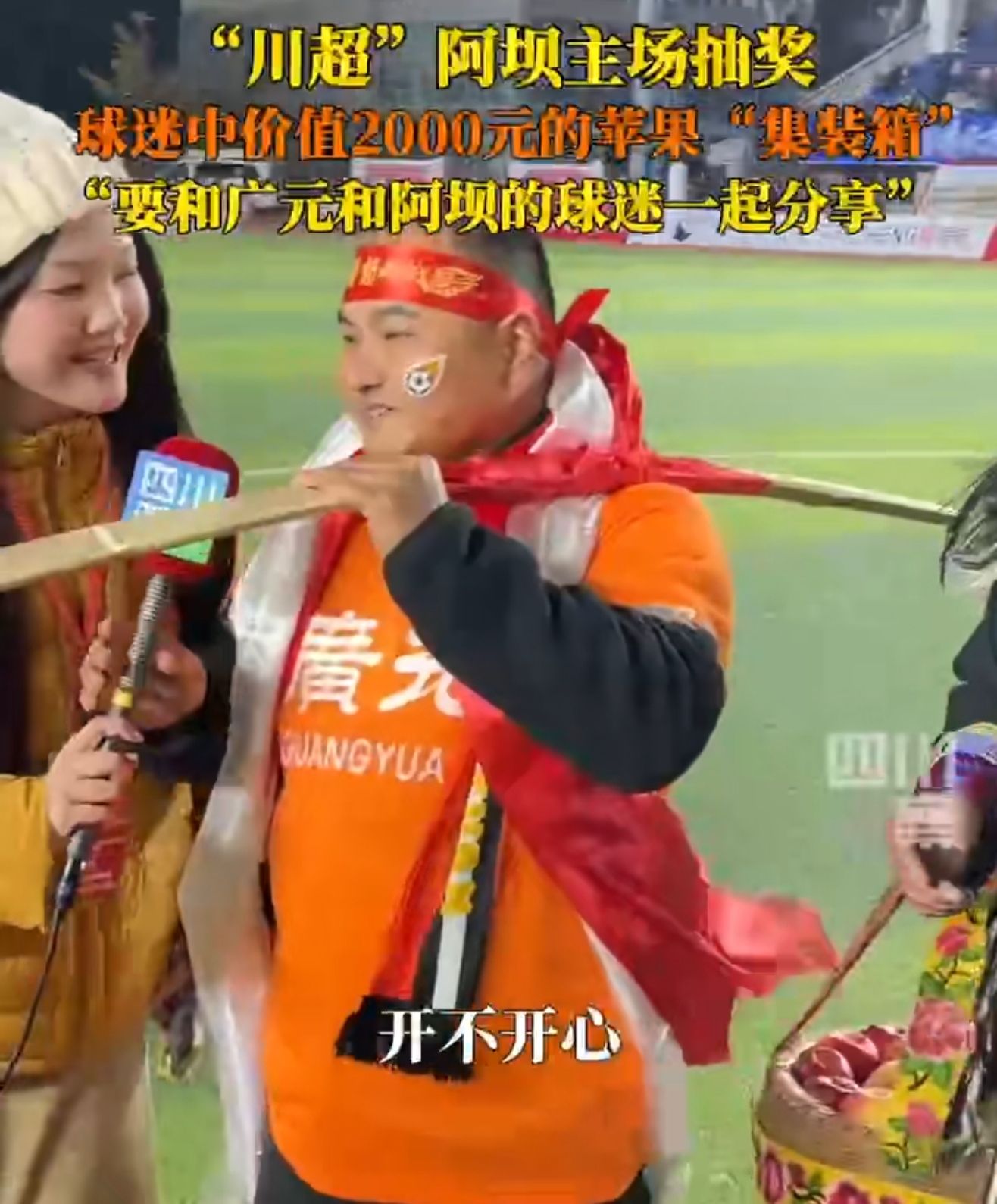 还比如,阿坝对战广元的中场抽奖环节,来自广元的幸运观众喜提价值2000元的茂县瑞雪苹果,并当场喊话要和广元、阿坝其他球迷一起分享。你看,这胜负,哪有苹果甜哦!