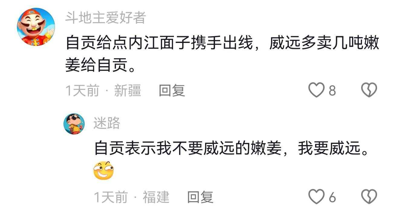 从揭幕战打到现在,在各大城市球迷见缝插针、叽叽喳喳的“安利”下,相信广大吃瓜群众和我一样对21市州的土特产有了更深刻的认识。比如,内自兄弟赛前就先上演了一场“威远之争”↓
