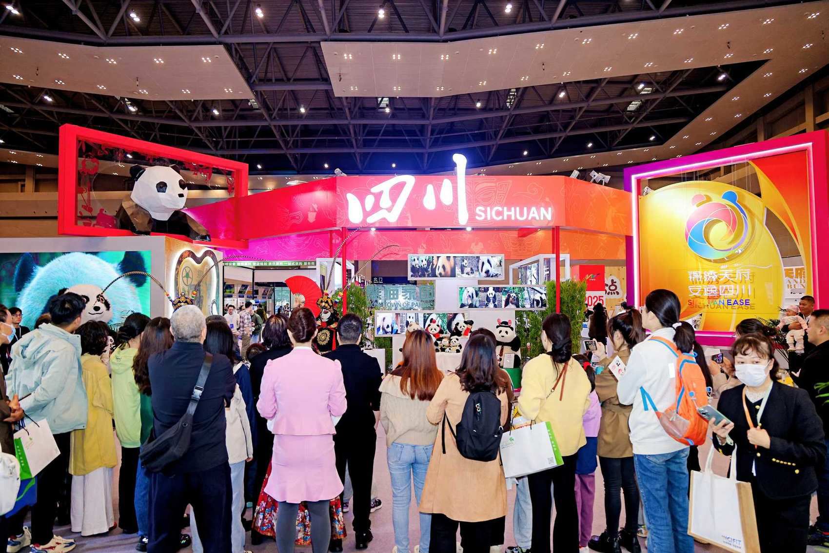 展会期间,川剧变脸表演惊艳全场,“一张脸谱藏万千气象”的演绎,成为巴蜀文化的生动诠释。“安逸熊猫”人偶巡游发放四川文旅邀请函,为游客送上暖心好礼。