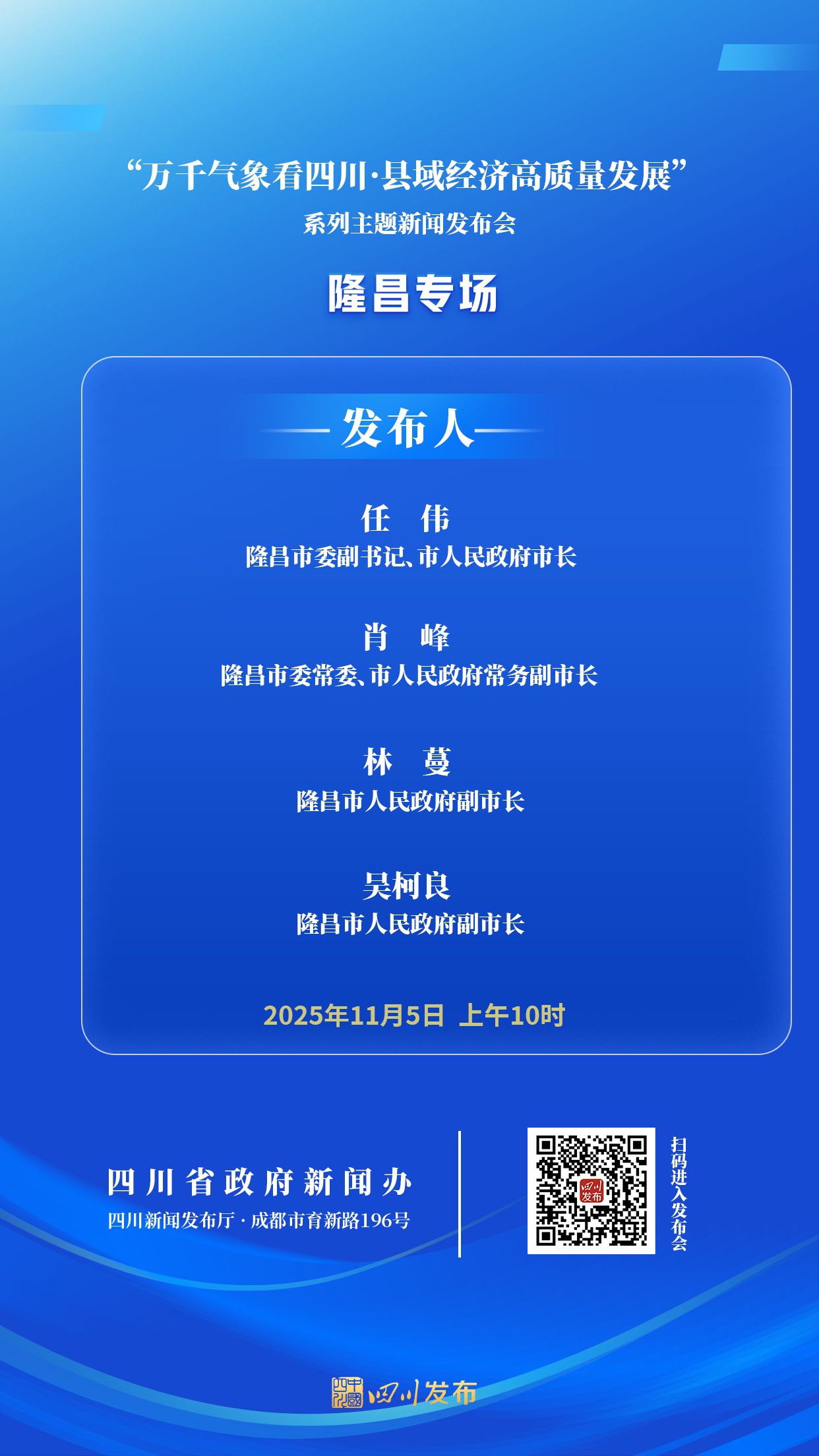 2025年11月5日(星期三)10:00,省政府新闻办将在四川新闻发布厅举行“万千气象看四川·县域经济高质量发展”系列主题新闻发布会隆昌专场,隆昌市委副书记、市人民政府市长任伟围绕“产城融合促升级 书写靓丽幸福隆昌发展新篇章”作介绍并答记者问,隆昌市委常委、市人民政府常务副市长肖峰,隆昌市人民政府副市长林蔓、副市长吴柯良答记者问。四川发布客户端将全程图文直播,敬请关注!