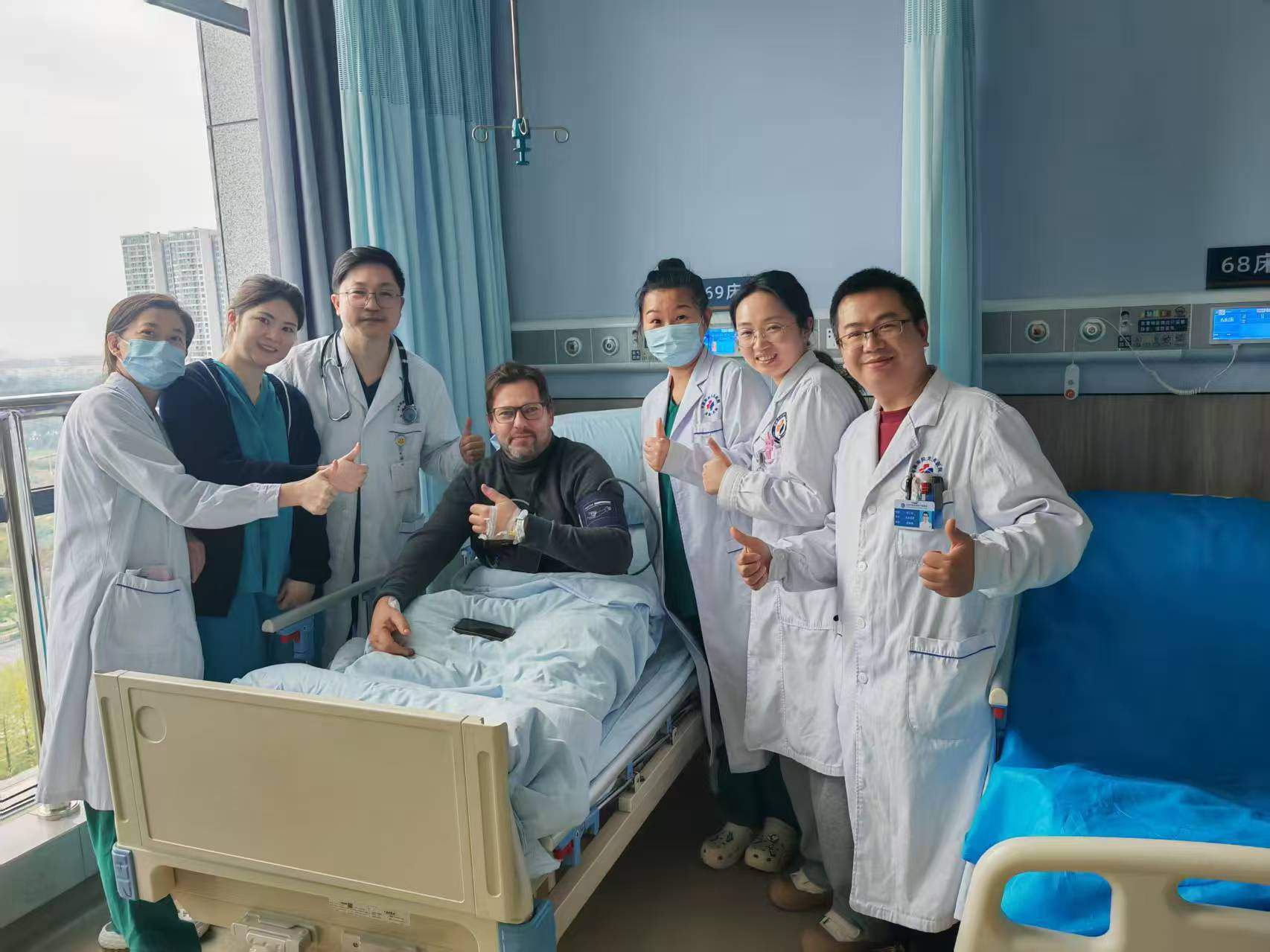 在介入中心带领下,心血管内科、急诊、ICU、心病科、麻醉手术中心等多学科团队紧密协作,手术(含前期准备20分钟)仅用40分钟便顺利完成支架植入,闭塞的血管成功再通。考虑到索尔伯格的外籍身份,护理团队同步提供双语沟通服务,在ICU及心病科给予全程细致关怀,让他在异国他乡感受到了温暖与安心。术后2天,索尔伯格顺利出院。