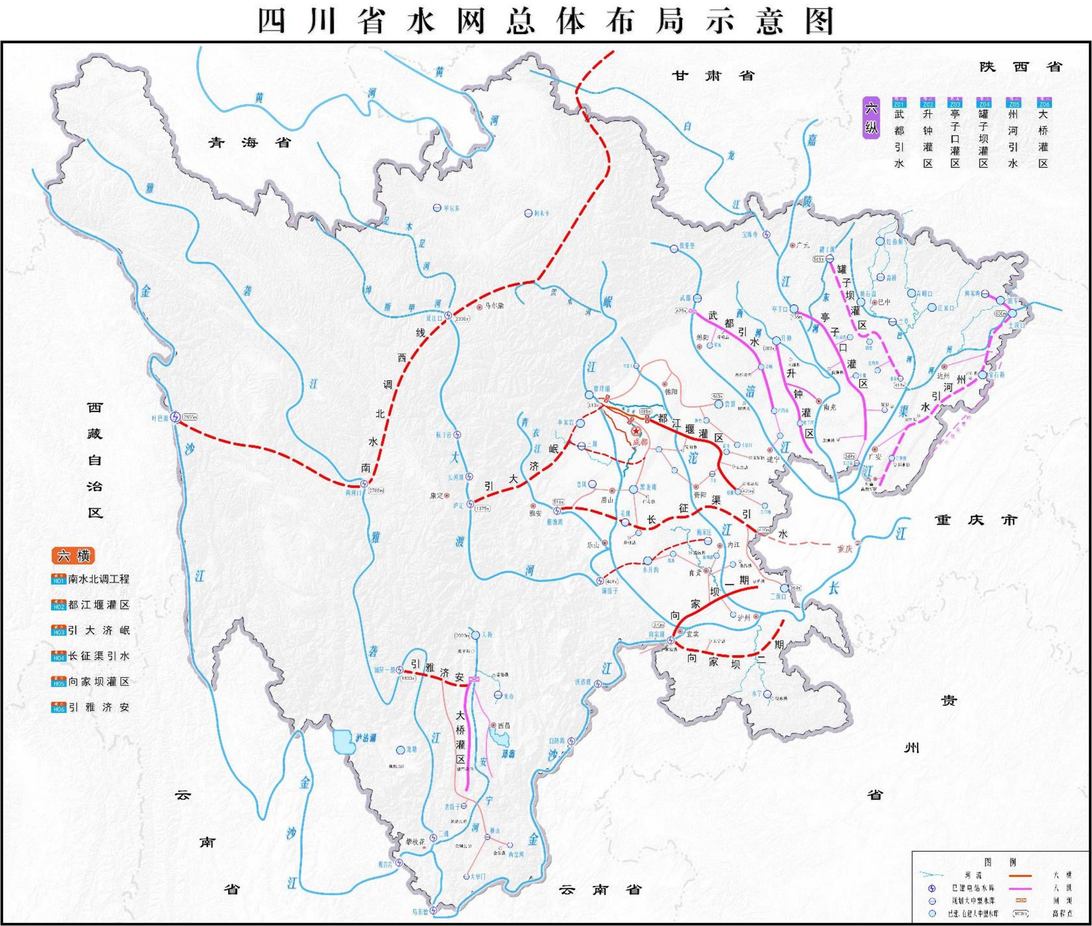六横是都江堰、引大济岷、长征渠、向家坝、引雅济安、南水北调西线工程,六纵是武都、升钟、大桥、亭子口、罐子坝、川渝东北一体化水资源配置工程,力争到2030年骨干水网总体架构基本完成。