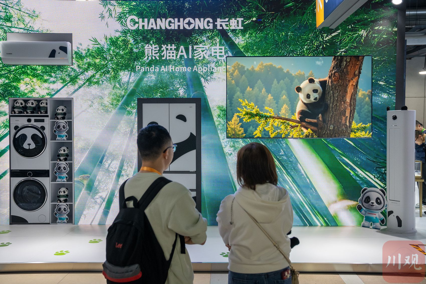 电视机、洗衣机、冰箱、空调这些常规家电产品,还能翻出什么新花样?四川馆入口的一整面墙,变成了呆萌可爱的“熊猫乐园”,而上述这些家电,根据熊猫的形象全部换了个“造型”。作为长虹在国内首次亮相的熊猫AI家电,此次主打一个出其不意,受到了观众特别是国外采购商和专业观众的喜爱。
