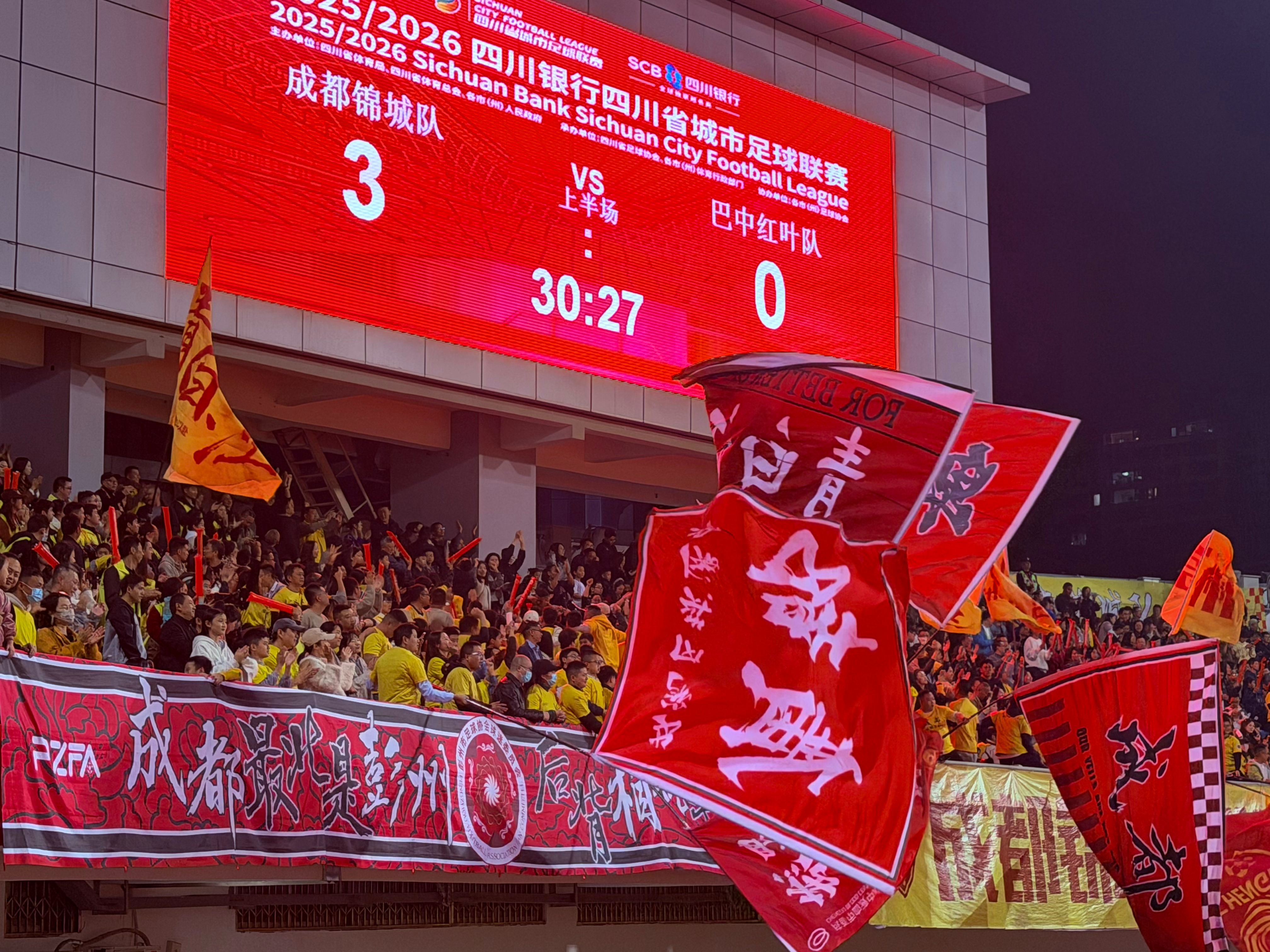 11月8日晚,2025/2026四川银行四川省城市足球联赛川东赛区第八轮比赛正式打响,成都锦城队主场迎战巴中红叶队。音响轰鸣,看台沸腾,在全场两万多人的看台上,两个上班族的身影定义了何为“为城市而战”。