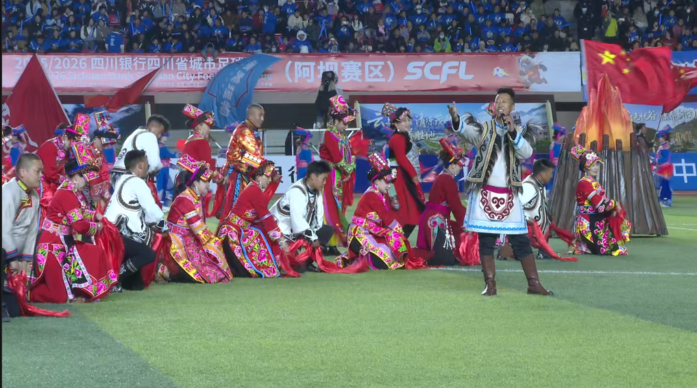 在文艺表演中,阿坝文艺团队精心编排了歌舞表演《向着世界放歌》作为核心节目。节目融合了阿坝州藏族、羌族等多民族的音乐元素与舞蹈风格,演员们身着色彩艳丽的民族服饰,用嘹亮的歌声传递高原儿女的豪情,以灵动的舞姿展现民族文化的灵动。演出中,象征着热情与祝福的羌红和哈达频频亮相,不仅是对“川超”的美好祝愿,更是对现场观众的诚挚问候,赢得了阵阵掌声与欢呼声。