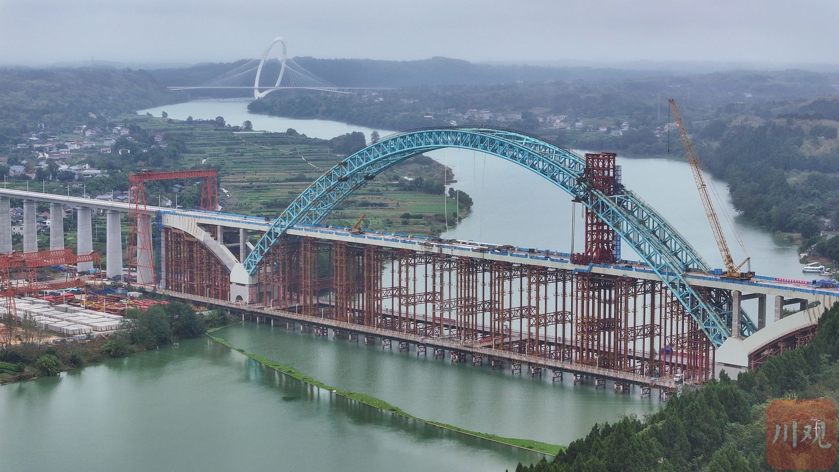 从成都市区驱车前往简阳市石钟镇,沱江边上,一座蓝色钢铁拱桥架在离河面百米高的空中。桥拱如弯弓,桥梁如弓弦,随着10日凌晨的合龙,稳稳地“绷”在两岸。