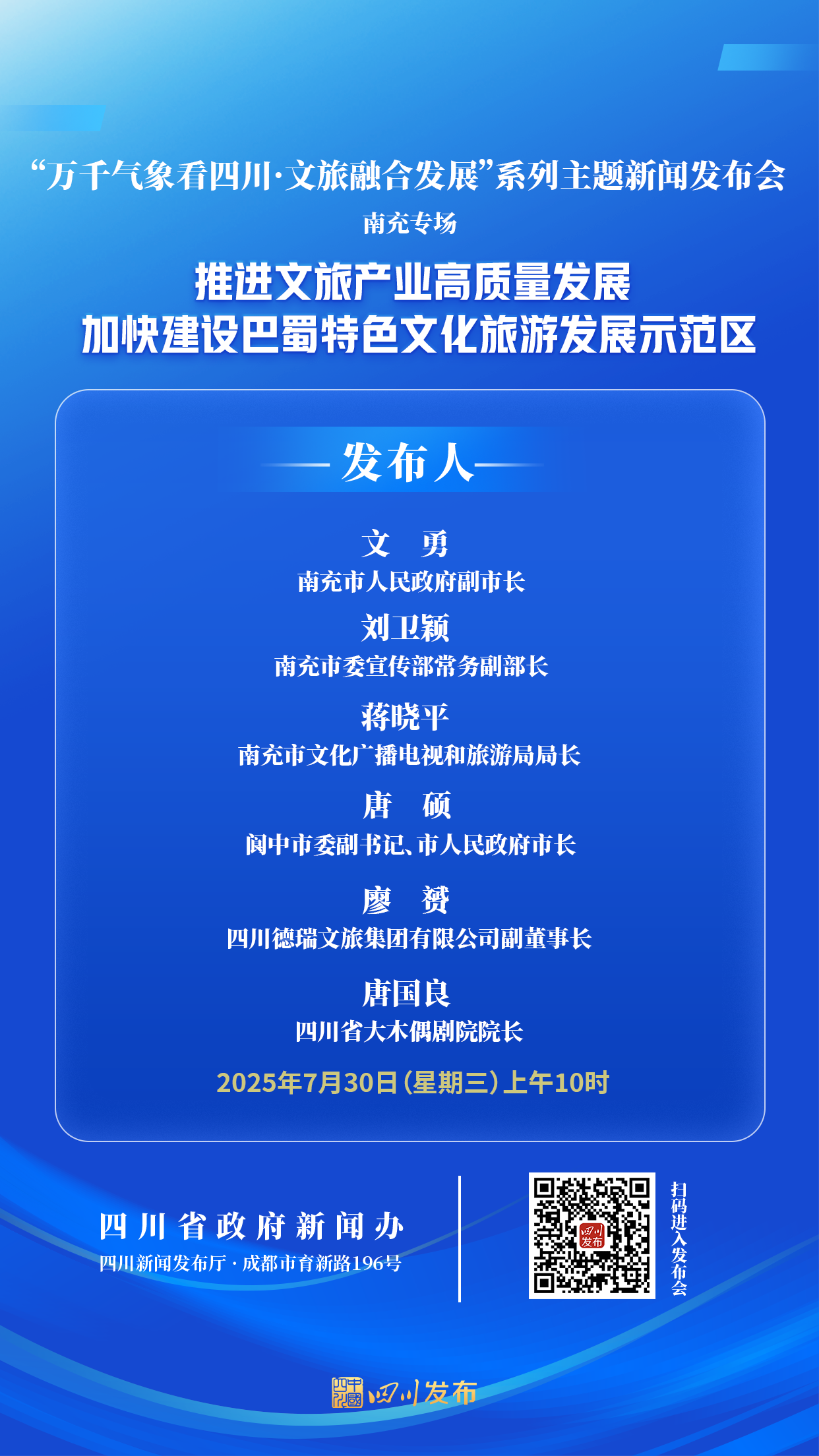 2025年7月30日(星期三)10:00,省政府新闻办将在四川新闻发布厅举行“万千气象看四川·文旅融合发展”系列主题新闻发布会南充专场,南充市人民政府副市长文勇围绕“推进文旅产业高质量发展 加快建设巴蜀特色文化旅游发展示范区”作介绍,南充市委宣传部常务副部长刘卫颖,南充市文化广播电视和旅游局局长蒋晓平,阆中市委副书记、市人民政府市长唐硕,四川德瑞文旅集团有限公司副董事长廖赟,四川省大木偶剧院院长唐国良答记者问。四川发布客户端将全程图文直播,敬请关注!