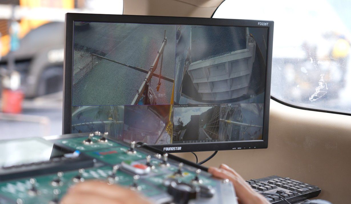 技术员在远程遥控摊铺技术的显示器上,可以清晰看到隧道洞内的画面。