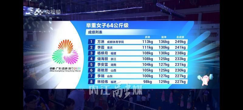 11月12日,第十五届全国运动会举重女子64公斤级决赛在广东东莞举行。来自成都体育学院的内江籍运动员方淋,击败全国青年纪录保持者李霜和2025年世青赛该级别冠军杨柳月,夺得职业生涯中的首枚全运会金牌。