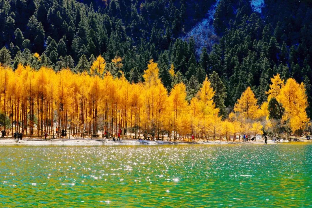 晨雾弥漫时,湖面如镜,倒映着雪山与彩林的影子,虚实交错间恍若仙境;偶尔有树叶飘落,泛起圈圈涟漪,更添几分灵动。