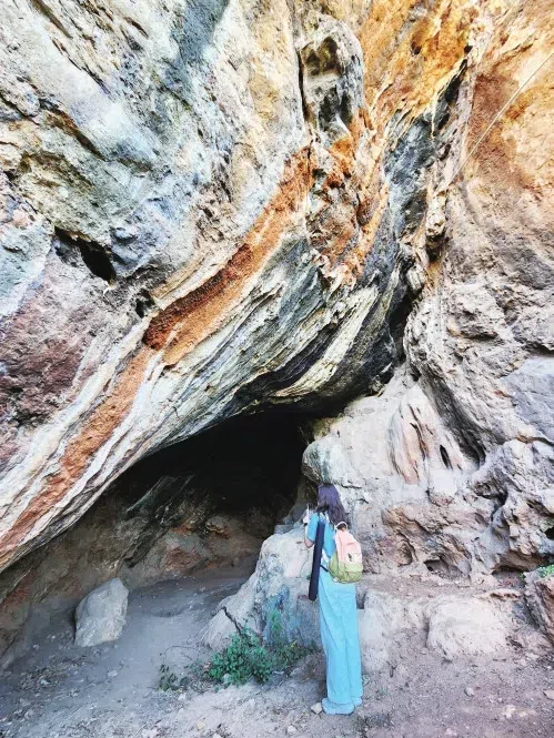 沿着山崖边的石梯往下走,路的尽头,出现一个三角形的石灰岩溶洞,回龙湾洞穴遗址就在这里。此处四面环山,流水、红砂、芒硝……在岩壁上留下黑、白、红、黄四种颜色。