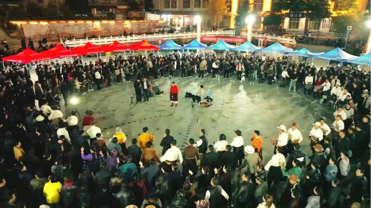 晚上七点半,几十把弦胡同时拉响,四五百人里三层外三层围成一个同心圆,歌声、舞步声伴着弦胡声在广场回荡,飞向远处的雪山和草原,飞进县城的大街小巷。