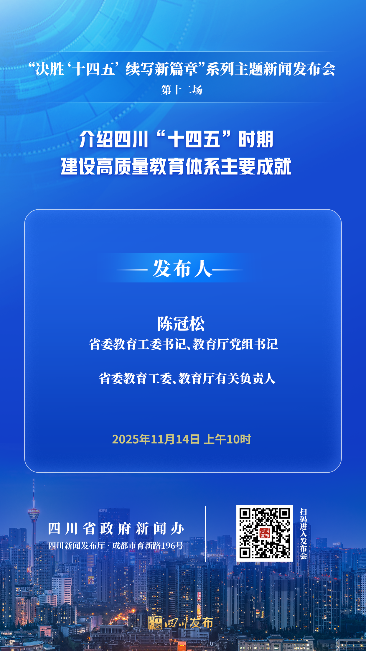 2025年11月14日(星期五)10:00,省政府新闻办将在四川新闻发布厅举行“决胜‘十四五’ 续写新篇章”系列主题新闻发布会第十二场,省委教育工委书记、教育厅党组书记陈冠松围绕四川“十四五”时期建设高质量教育体系主要成就作介绍并答记者问,省委教育工委、教育厅有关负责人参加答记者问。四川发布客户端将全程图文直播,敬请关注!