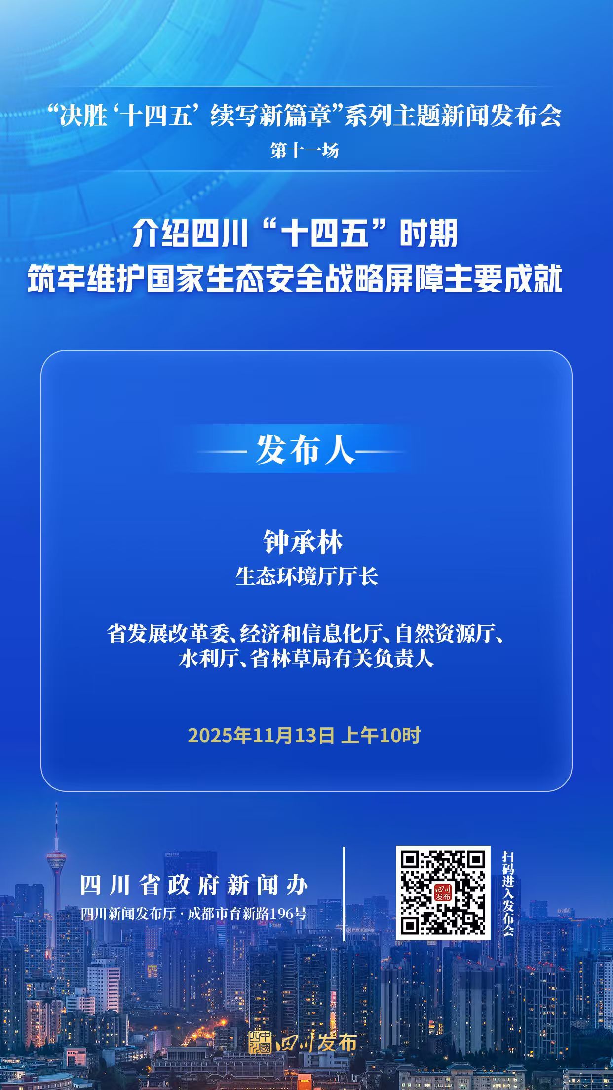 2025年11月13日(星期四)10:00,省政府新闻办将在四川新闻发布厅举行“决胜‘十四五’ 续写新篇章”系列主题新闻发布会第十一场,生态环境厅厅长钟承林围绕四川“十四五”时期筑牢维护国家生态安全战略屏障主要成就作介绍并答记者问,省发展改革委、经济和信息化厅、自然资源厅、水利厅、省林草局有关负责人参加答记者问。四川发布客户端将全程图文直播,敬请关注!