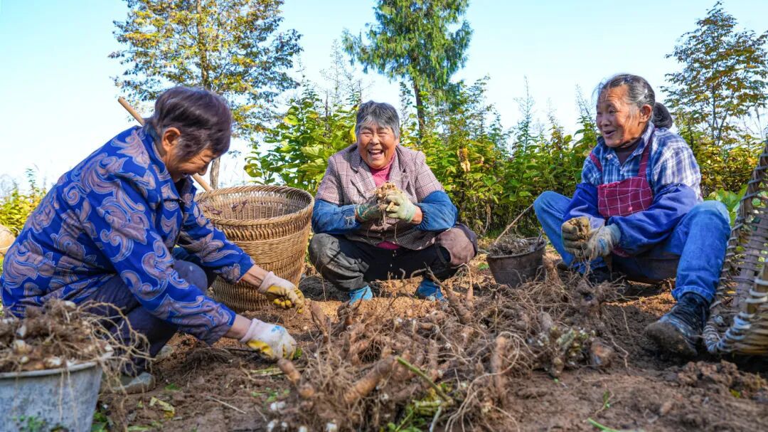 不远处,李兰英、周玉群坐在锄把上,手里剥着玄参的须根。李兰英瞅着满田的玄参,忍不住问,“我们种这么多,卖得起价不?别忙活一场白干了。”