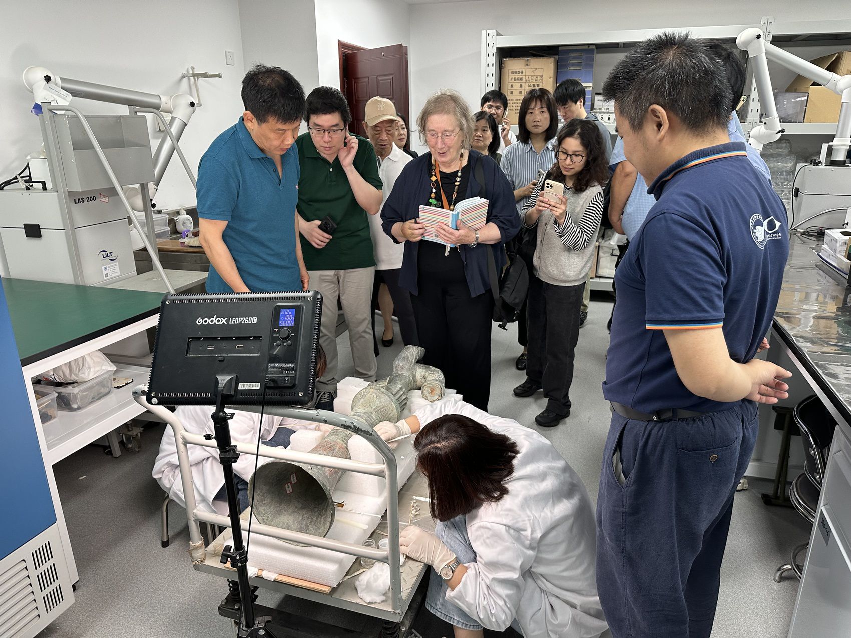 2024年5月28日,英国考古学家、牛津大学教授杰西卡·罗森在文物保护修复实验室观摩文物。新华社发(四川省文物考古研究院供图)