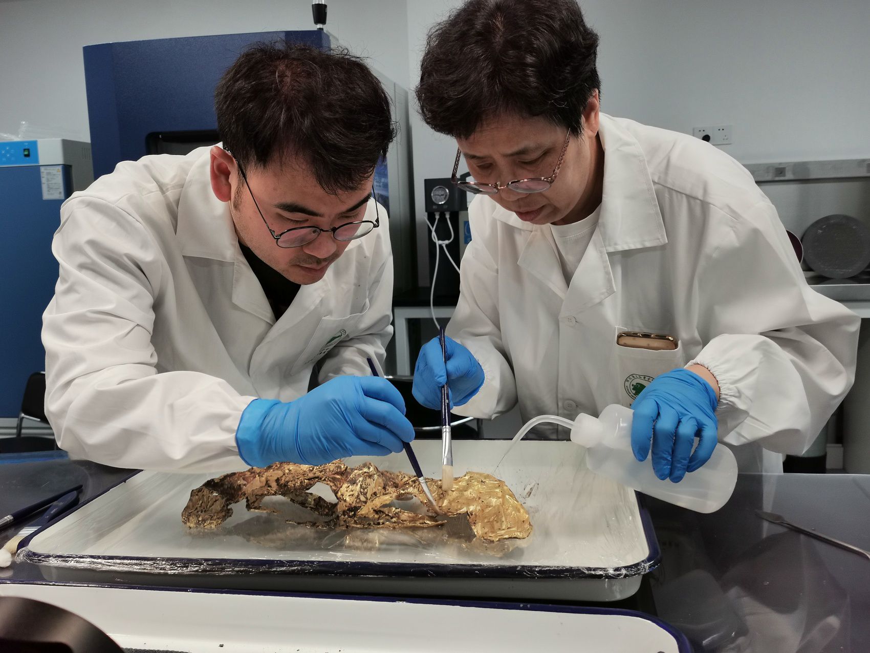 2023年7月,马燕如(右)带着鲁海子(左)修复三星堆遗址出土的黄金面具。新华社发(四川省文物考古研究院供图)