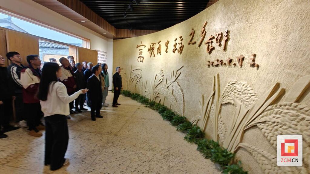 再生稻历史文化基地内,讲解员指着展区向观众介绍:“这里以再生稻为设计肌理,黄色主色调象征水稻丰收,上面‘富顺,再生稻之乡’几个大字,是袁隆平院士于2020年10月23日为富顺县题写的。”