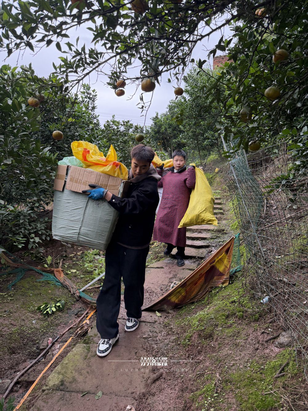 邓青松和黄健搬运柚子叶
