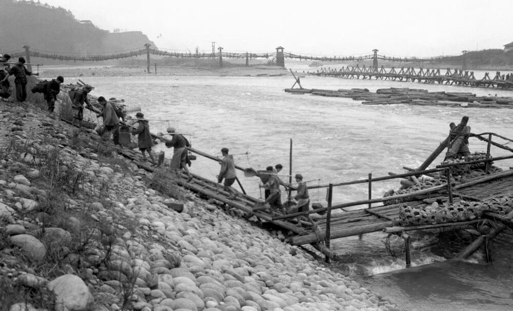 1962年11月15日,四川都江堰的岁修工程开始了,来自都江堰灌区各县的社员,在担沙运石进行截流岁修堰首工程。新华社记者 孙忠靖 摄