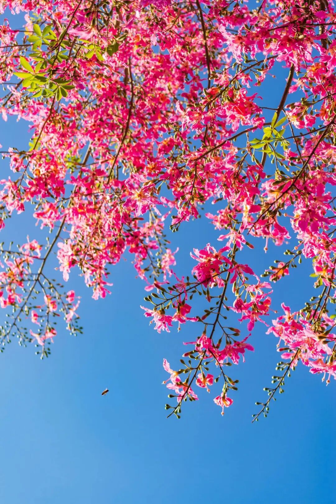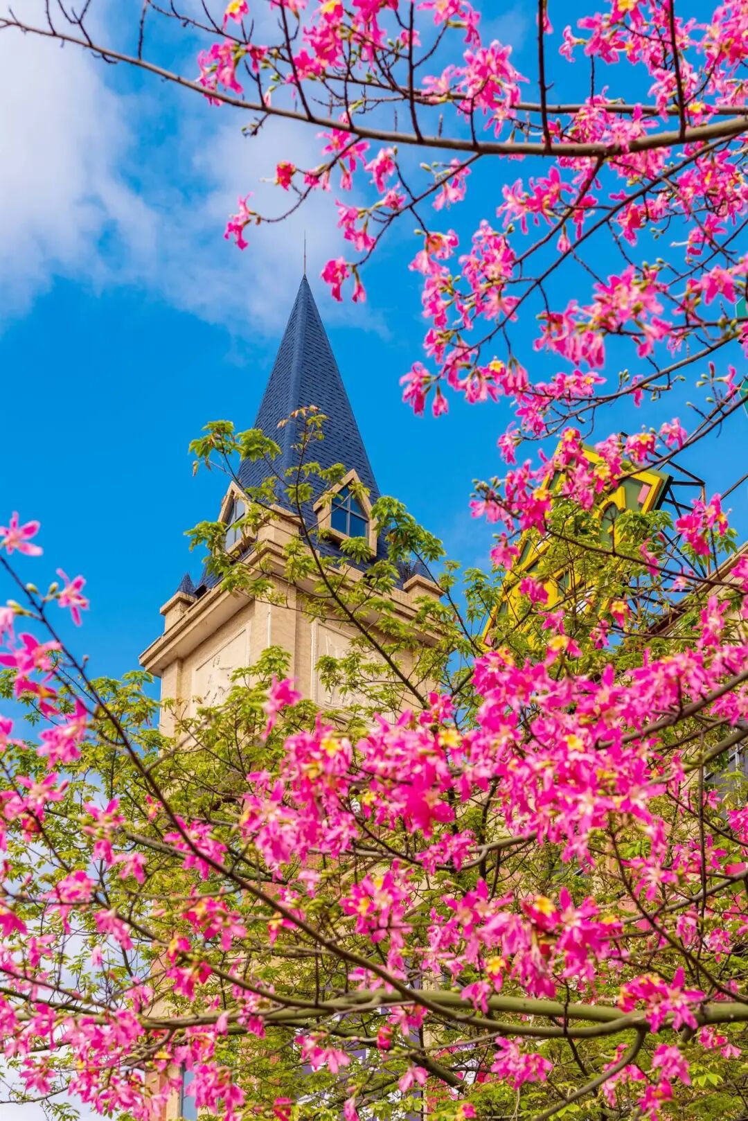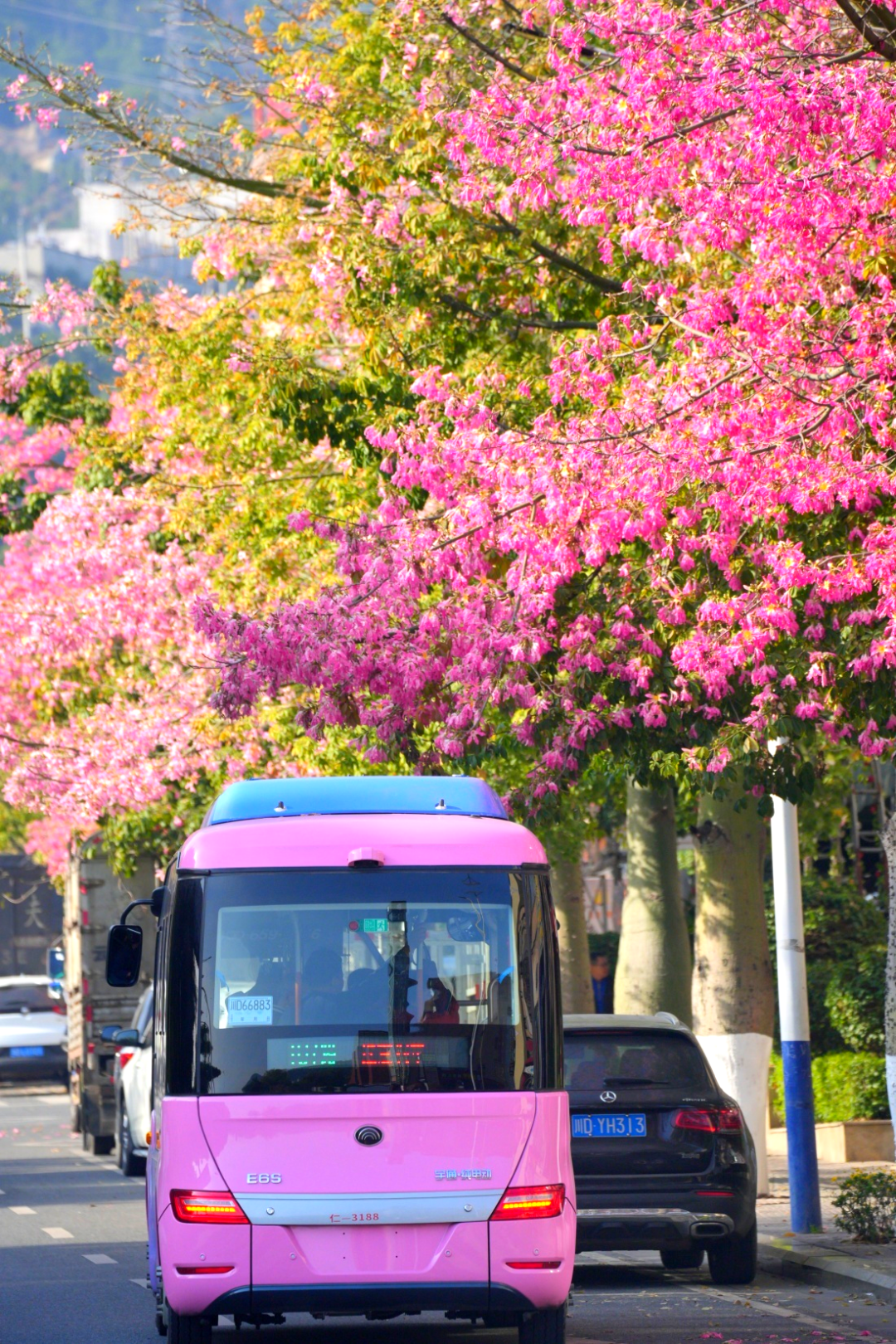 密密匝匝的花簇撑开如伞,与澄澈如洗的蓝天相映,随手定格便是自带柔光的胶片感大片。若想沉浸式感受这份美好,不妨搭乘粉色 “萌萌巴” 环线公交,车窗外粉浪翻涌,城市在花影中流动,每一段路程都成了与浪漫的不期而遇。
