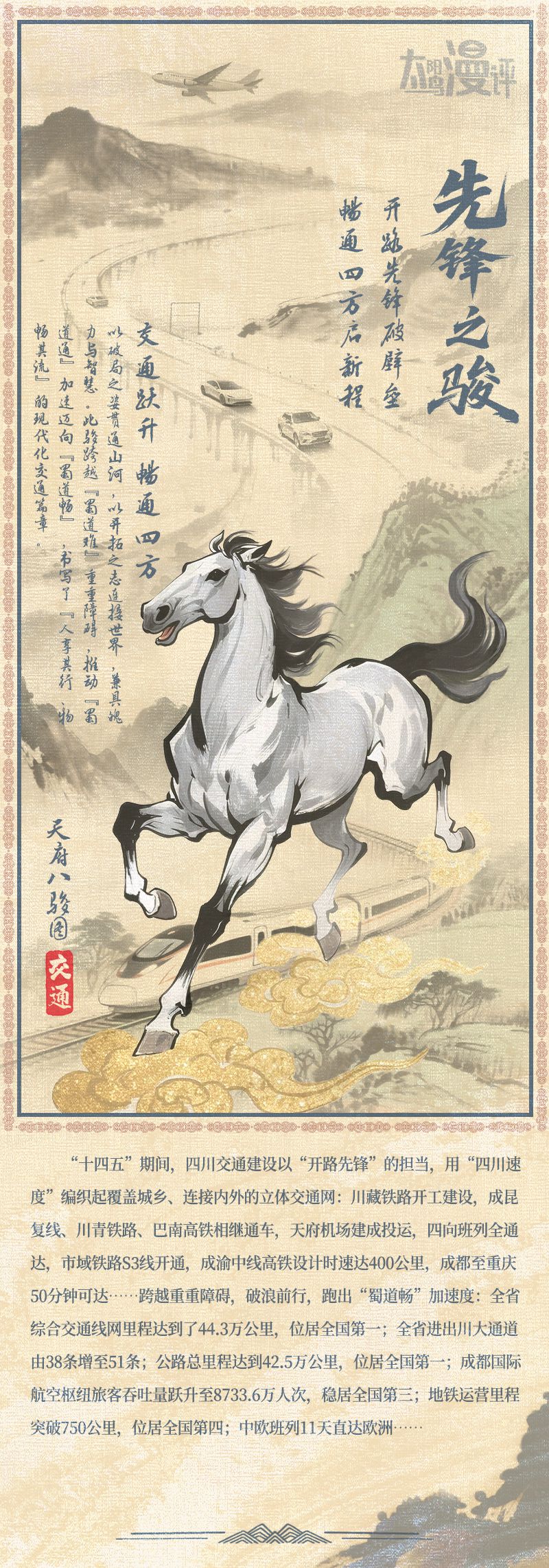 以破局之姿贯通山河,以开拓之势连接世界,兼具魄力与智慧。此骏跨越“蜀道难”重重障碍,推动“蜀道通”加速迈向“蜀道畅”,书写了“人享其行、物畅其流”的现代化交通篇章。