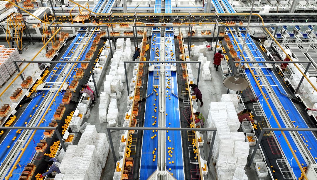 离祥泰果业不远处,川果智慧冷链物流中心同样一片忙碌,分选车间内,一排排现代化设备高速运转,一颗颗新鲜的柑橘顺着输送轨道依次进入分选流程。